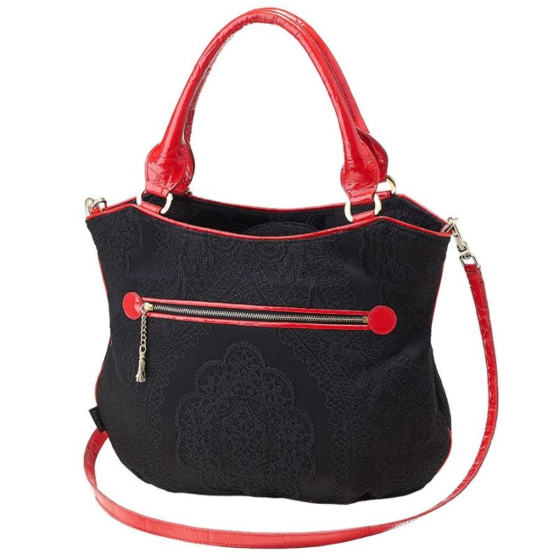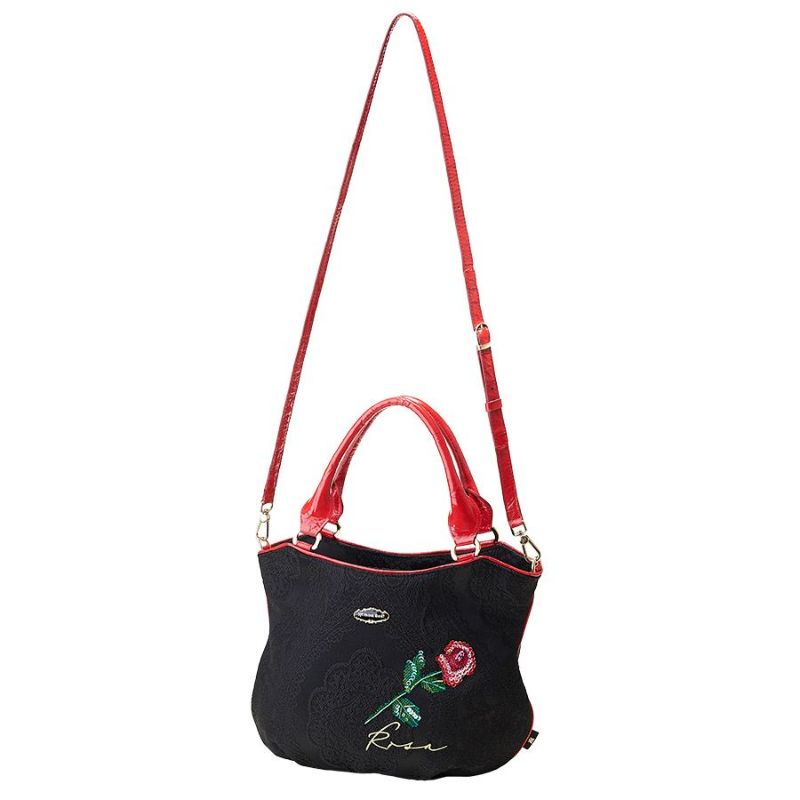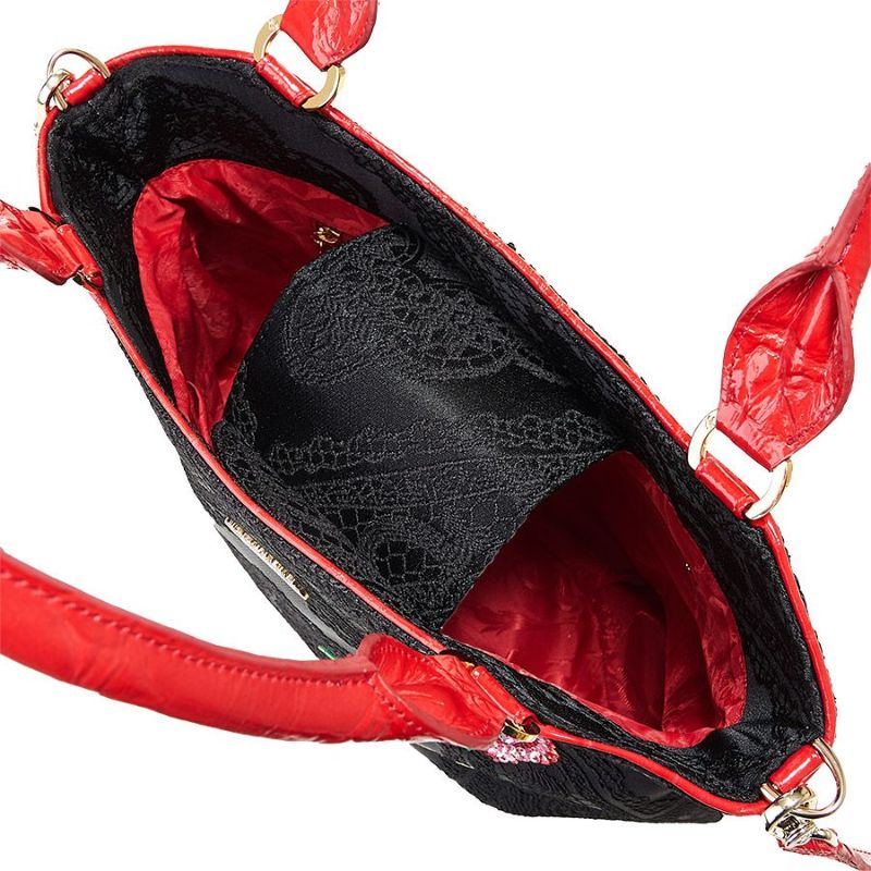 裏地はローズやハンドルなどに合わせて華やかなレッドの花柄ジャカード織生地でインパクト抜群。