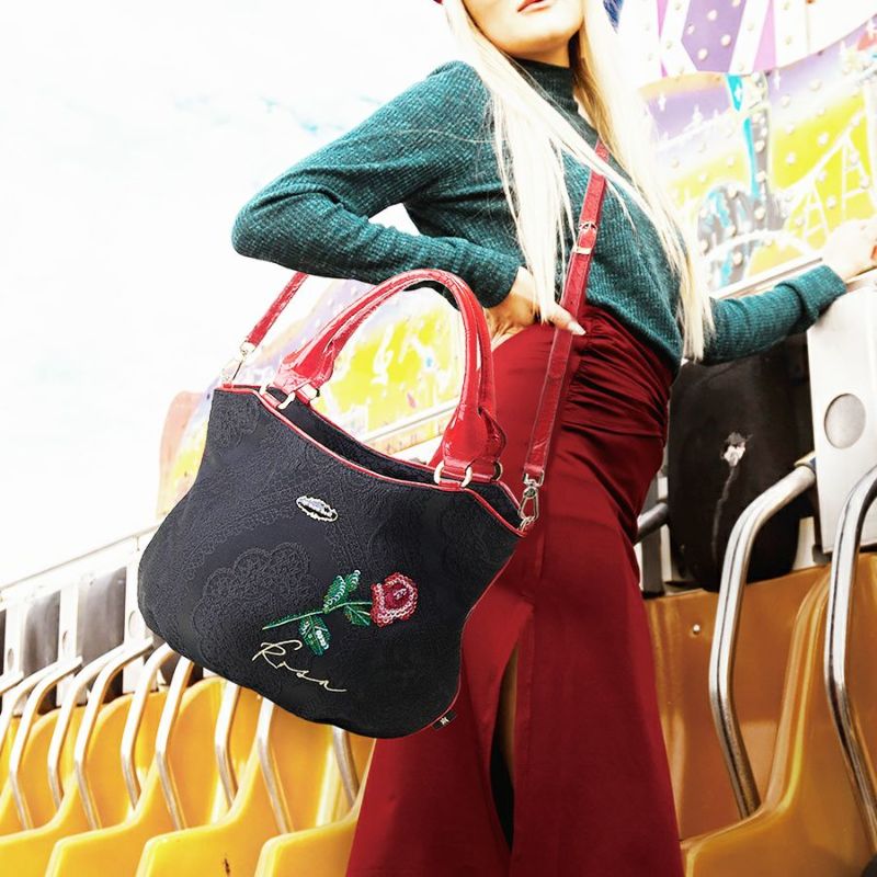 底鋲もモチーフのローズに合わせてレッドで統一。バッグを膝に置いた時にチラリと見えて隠れたポイントに。