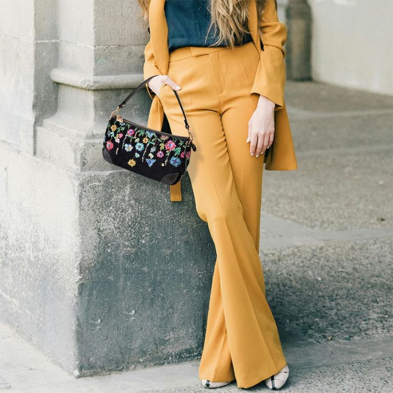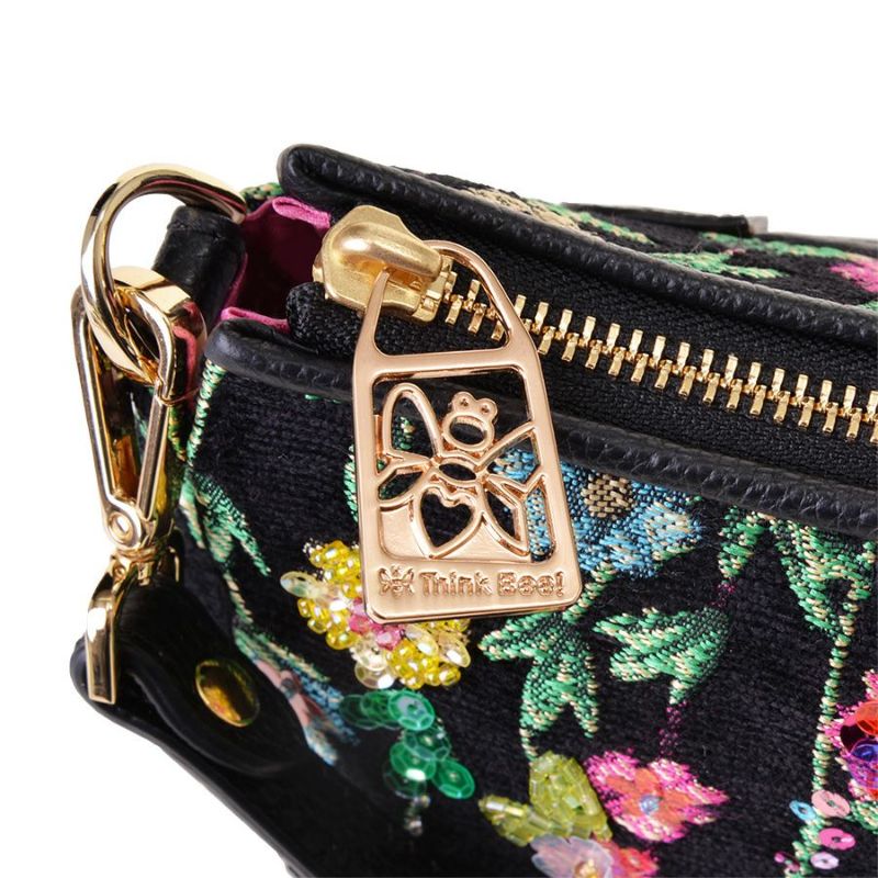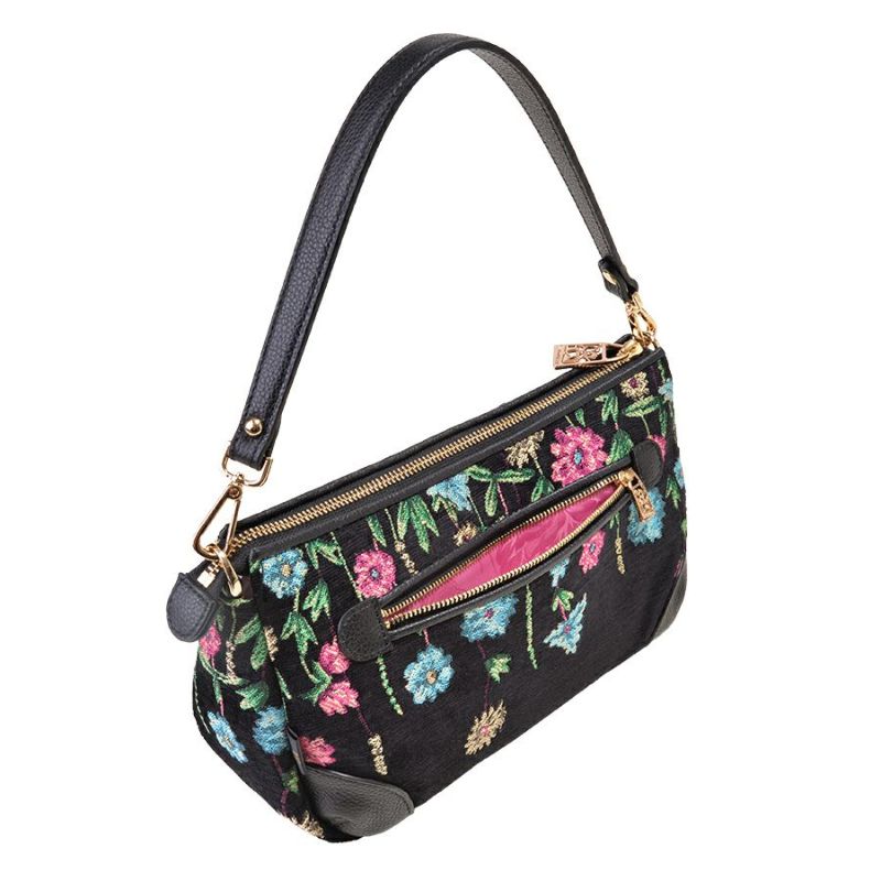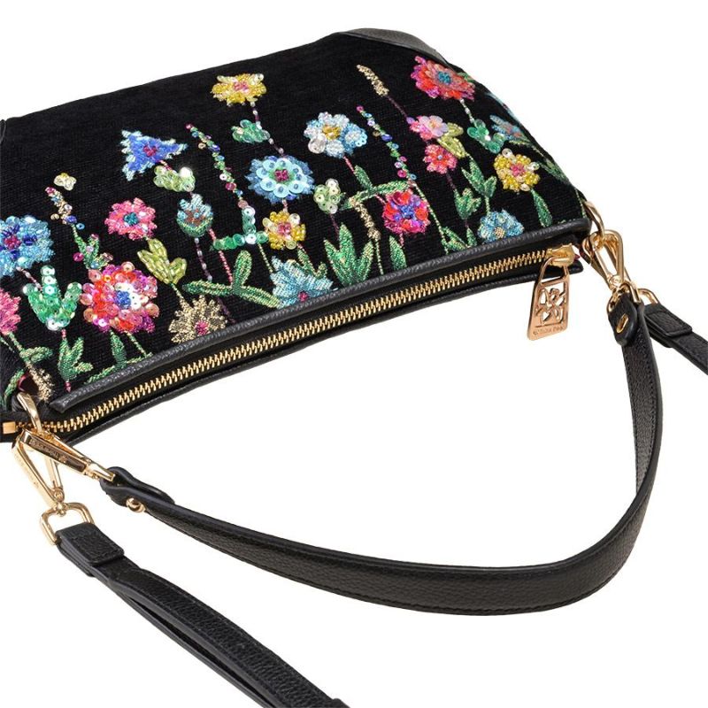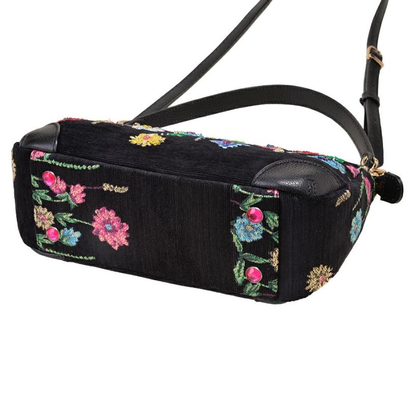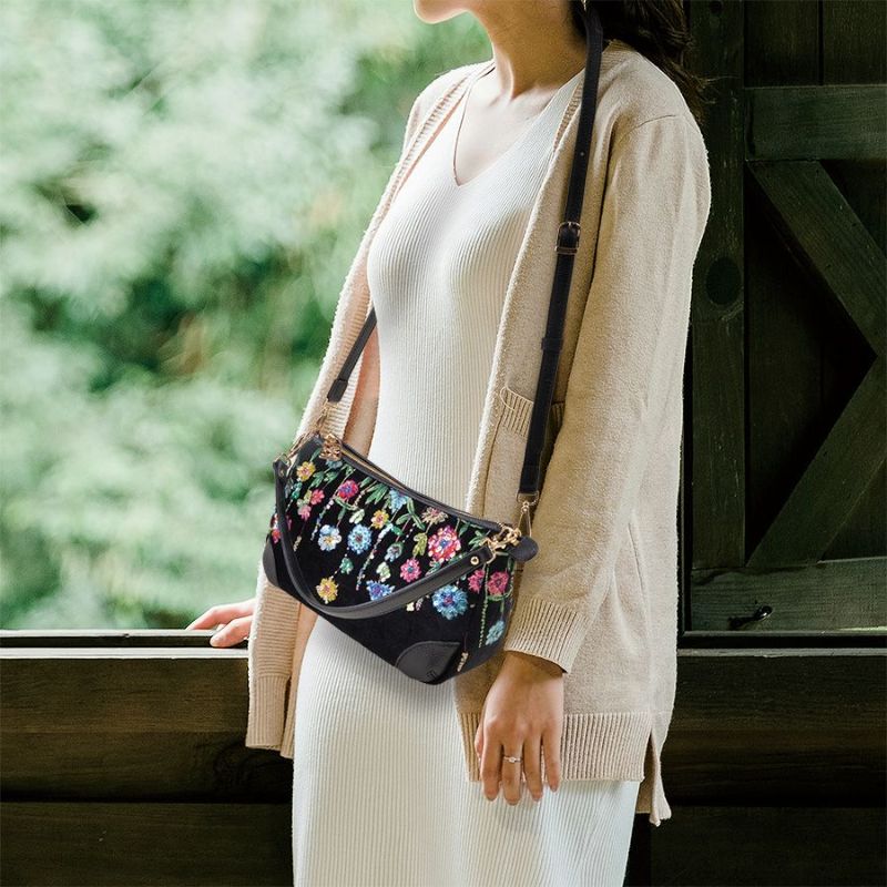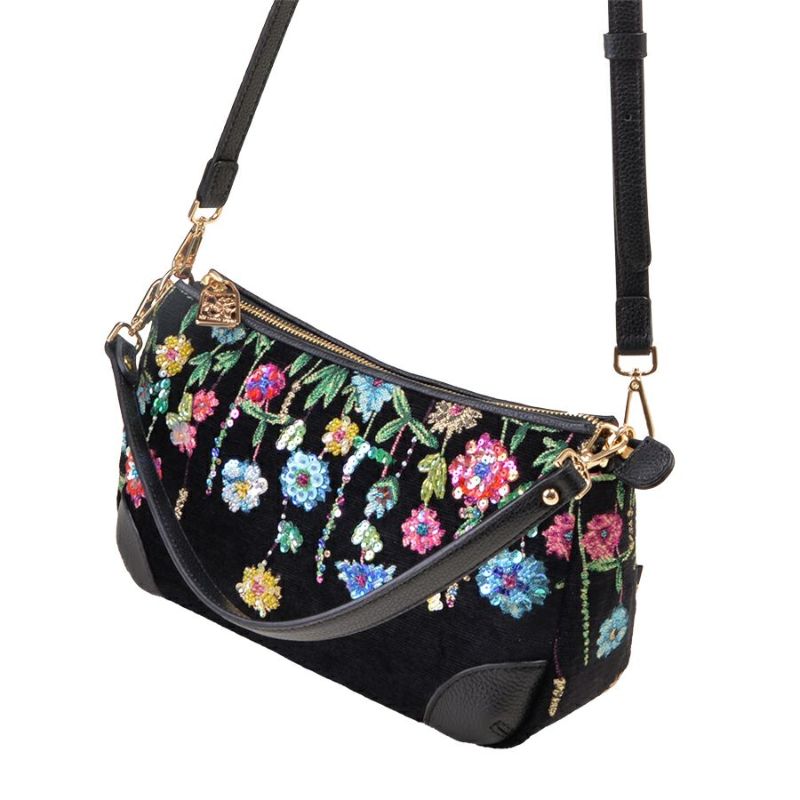 漆黒に煌めきながらカラフルな花々が咲き並ぶ手触りの良いトルコ製の織生地に、ビーズやスパンコール、クリスタルガラスを散りばめて可愛らしく華やかにアレンジ。