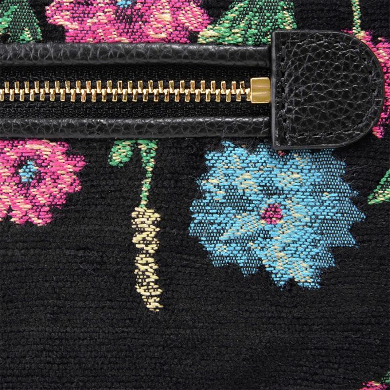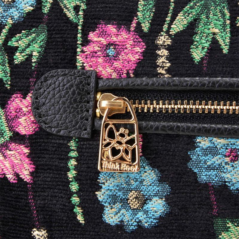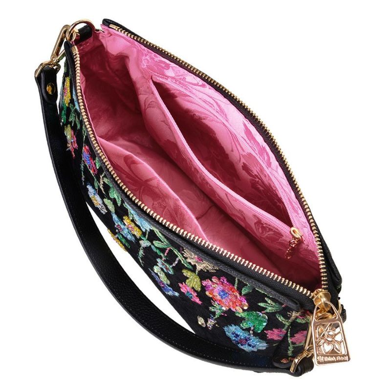 開口部は端まで大きく開くファスナー式で、出し入れラクラク。裏地はピンクの花柄ジャカード織生地が華やかな内装。