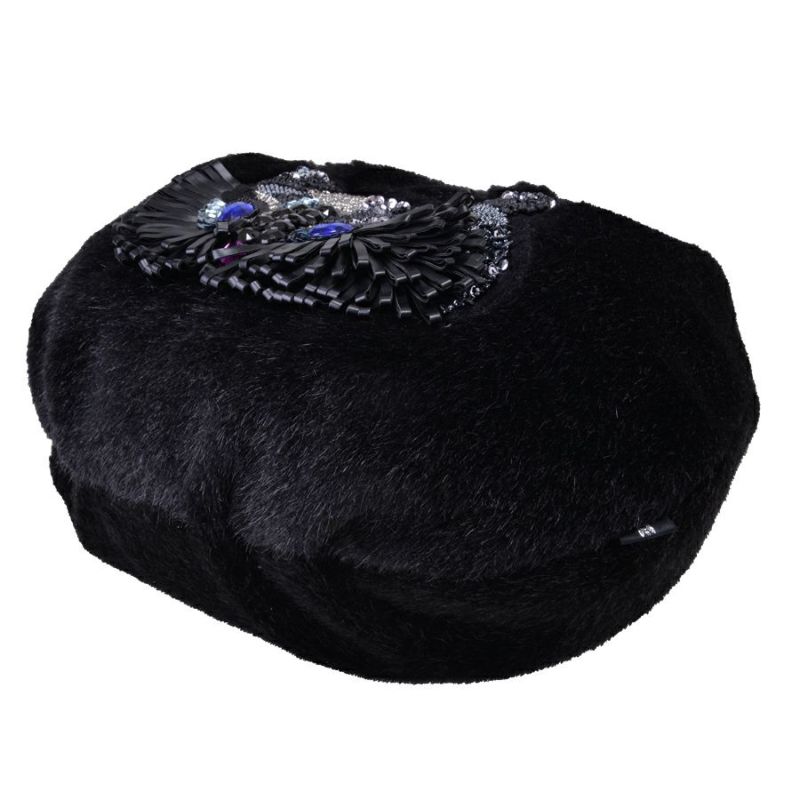 表面はエコレッキスファーを使用し、なめらかな手触りと上品な光沢感が魅力です。フロントには、ビーズやスパンコールを贅沢に敷き詰めて描いたフクロウの顔モチーフ。ブルーに輝く瞳がアクセントになり、シンプルな装いに遊び心をプラスします。 軽量で持ちやすく、肩にも掛けやすい一体型ハンドル仕様。秋冬のコーディネートを華やかに彩る、存在感たっぷりのバッグです。