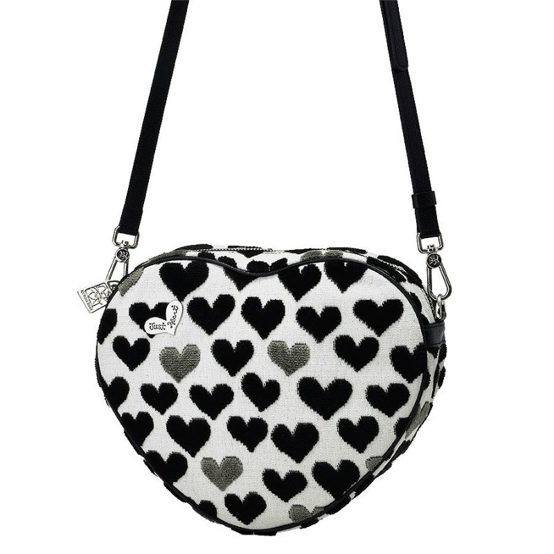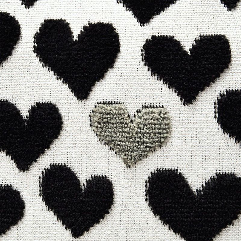 ハートモチーフのふんわりとした凹凸感がキュートで楽しいベルギー製生地で、フォルムもハート型に仕立てました。