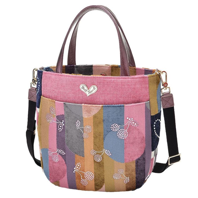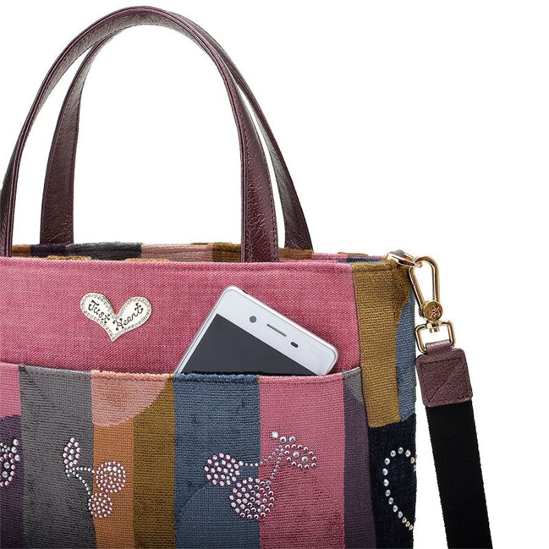 ハンドルとストラップのワインカラーのメタリックレザーとゴールドパーツのコンビネーションが、大人のチェリーを楽しめる落ち着いた雰囲気に。