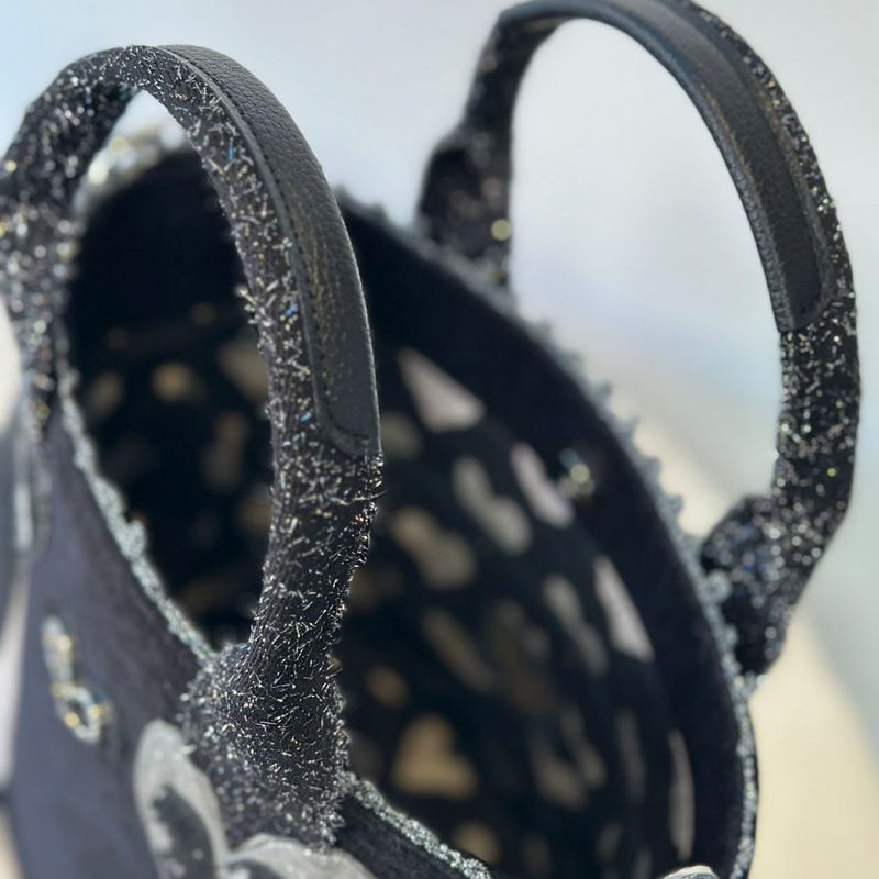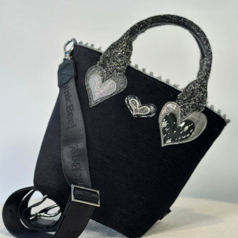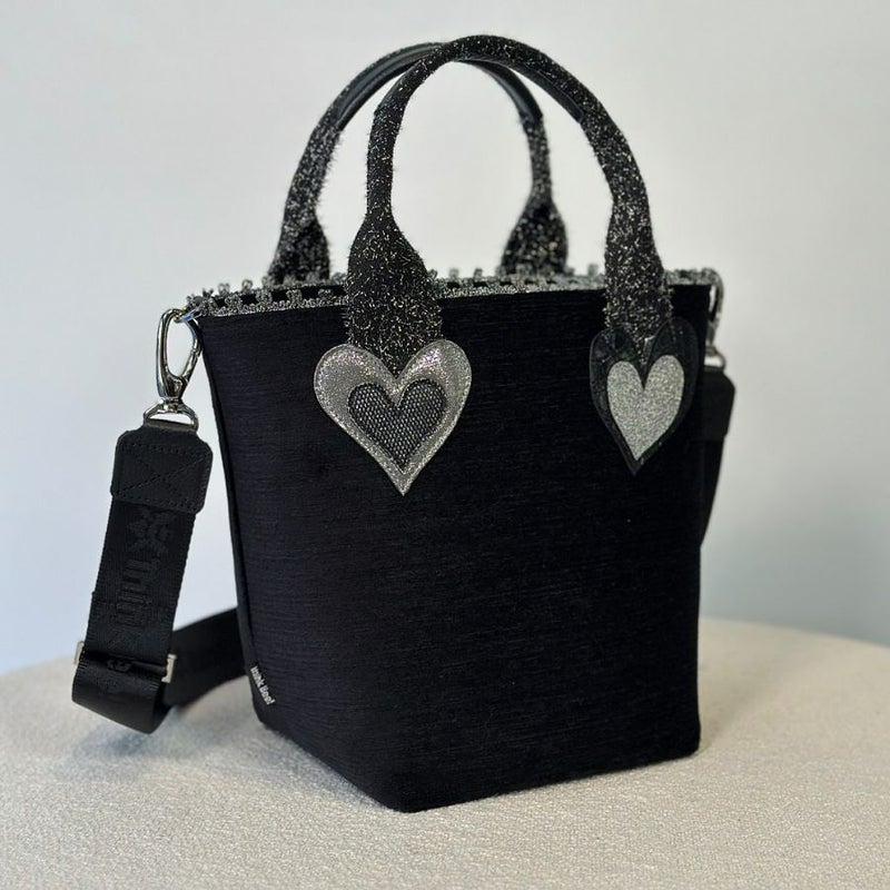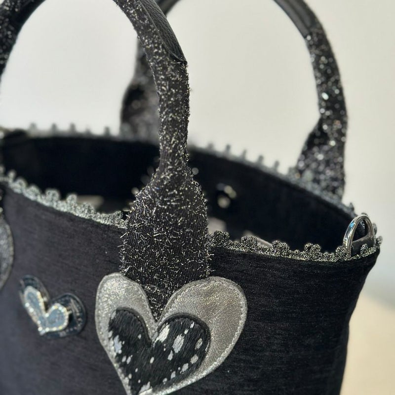 ハンドルとボディの接続部分には、グリッター素材のシルバーのハートを二つあしらい、ポイントとしてさりげない煌めきをプラス。 真っ黒な本体がシルバーの質感をより際立たせ、部分的に光るディテールを楽しめる仕上がりです。