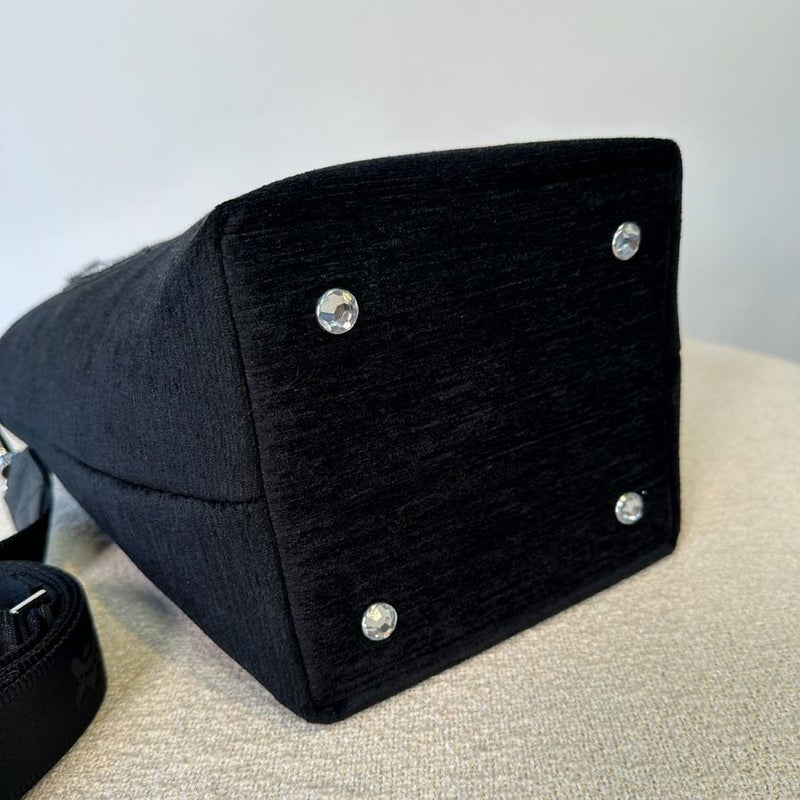 底には4つのラインストーン鋲を配置し、安定感と端正な印象をキープ。 ハンドでもショルダーでも美しく持てる、落ち着きの中に上品なきらめきを秘めた一点です。