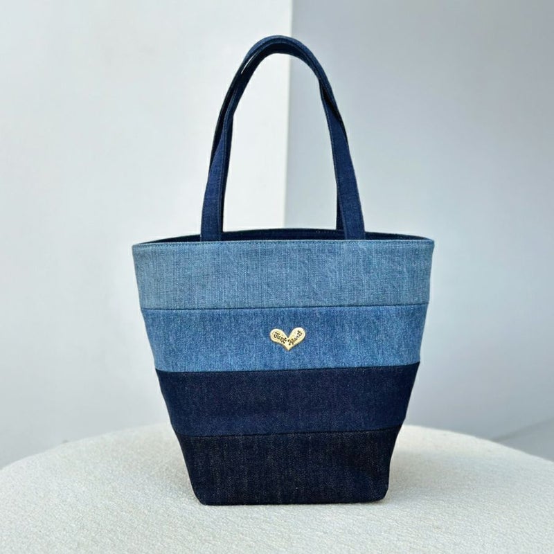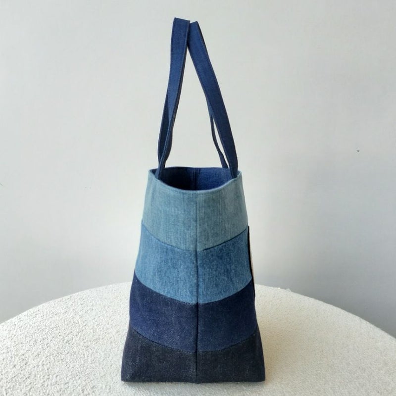異なる表情を持つ4色のデニムを、グラデーションになるよう丁寧にパッチワークしたトートバッグ。
