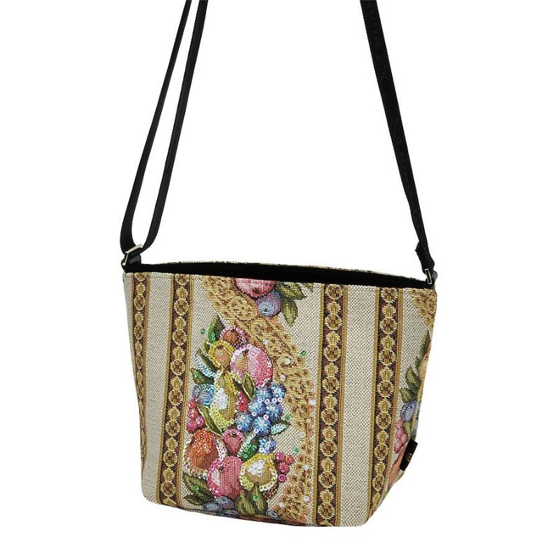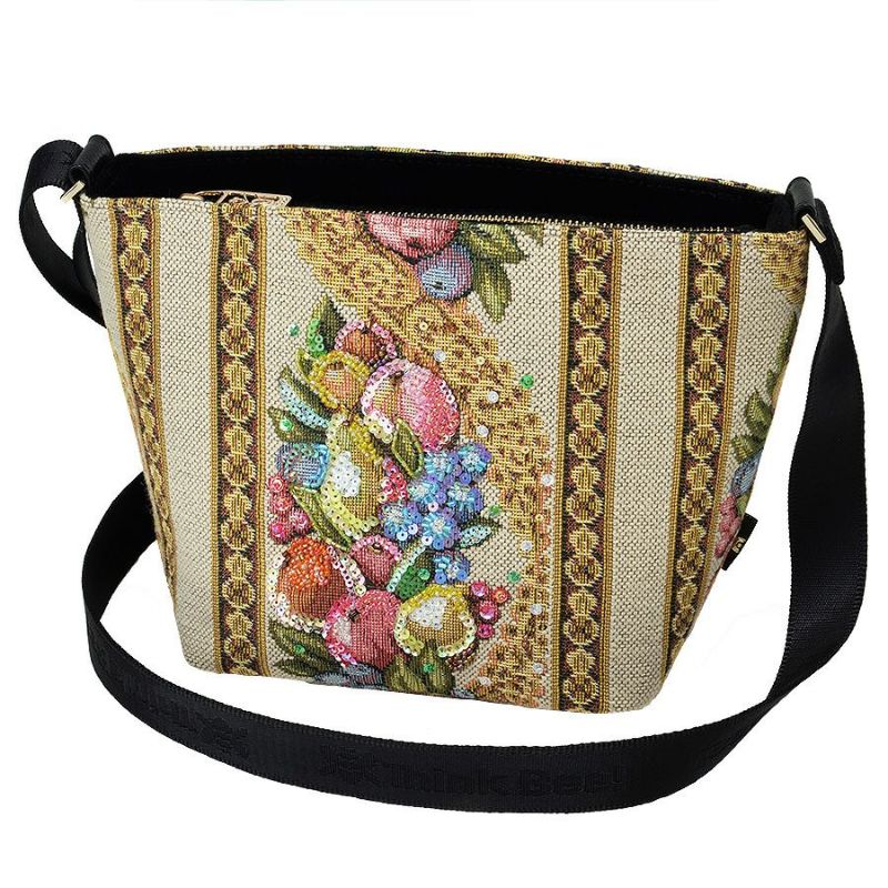 まるで絵画のように描き出された、たわわに実った杏やブルーベリー、洋梨などのフルーツと、優雅に舞うリボンが交差しあうデザインが印象的。