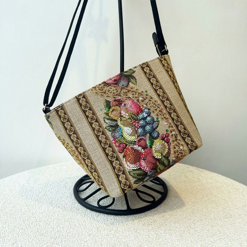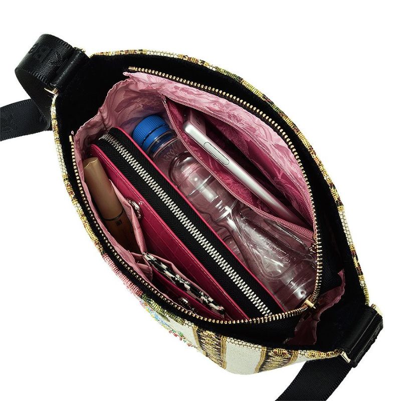 コットン10% | | ストラップ | ナイロン・牛革 | | その他 | - | | サイズ(約) | | 本体(突起部を除く最大) | H 19 × W 26.5 × D 13 cm | | ハンドル立ち上がり | -/- | | ショルダーストラップ長さ | 71~133 cm/無段階調節 | | 重さ | 380g | | | 仕様 | | 開口部 | ファスナー式 | | メイン室 | 1 /- | | 内側 | ファスナー付ポケット×1・オープンポケット×2・前後オープンポケット×2 | | 外側 | - | | ハンドル | - /ショルダーストラップ | | 底鋲 | 4 | | その他 | 作品により柄の出方や装飾が異なる場合があります | | 補足情報 | | - | |