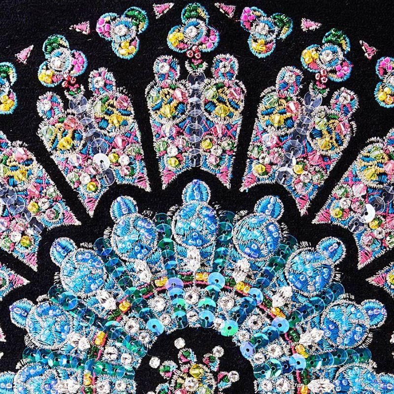 薔薇窓を様々な角度から写真撮影するところから、色彩を忠実に割り出して再現性にこだわり、世界最高峰の技術を誇る、中国・スワトウの技術と職人が丹精をこめて手刺繍を施しました。