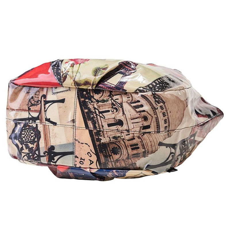 真紅の薔薇とリボンに彩られた楕円の大きな鏡に映るエッフェル塔とその存在を懐かしむように、周辺の景観がセピア色で描かれています。