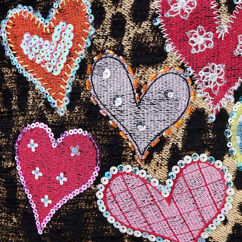 イタリア製レオパード柄のジャカード織生地をベースに、装飾はカラフルでポップなハートをミシン刺繍であしらい、その上にスパンコールやクリスタルガラスで多彩な煌めきを散りばめて、華やぎと可愛さUP。