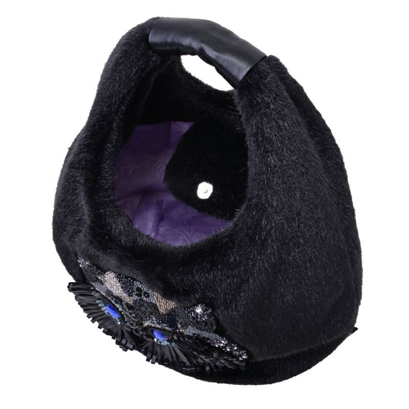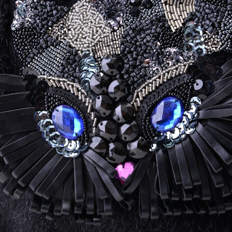表面はエコレッキスファーを使用し、なめらかな手触りと上品な光沢感が魅力です。フロントには、ビーズやスパンコールを贅沢に敷き詰めて描いたフクロウの顔モチーフ。ブルーに輝く瞳がアクセントになり、シンプルな装いに遊び心をプラスします。 軽量で持ちやすく、肩にも掛けやすい一体型ハンドル仕様。秋冬のコーディネートを華やかに彩る、存在感たっぷりのバッグです。