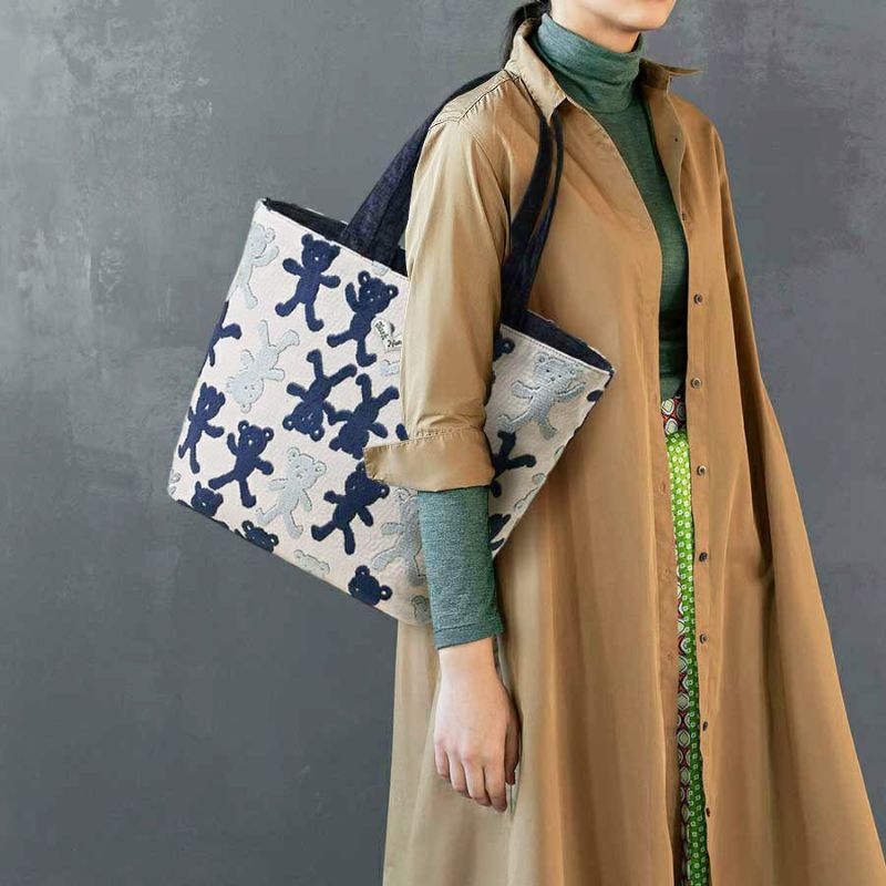 凸凹でクマちゃんを表現した表地は、パイルを凹凸に織り込んで柄を表現しているベルギー製の織物で、ふわふわとした手触りが特長です。