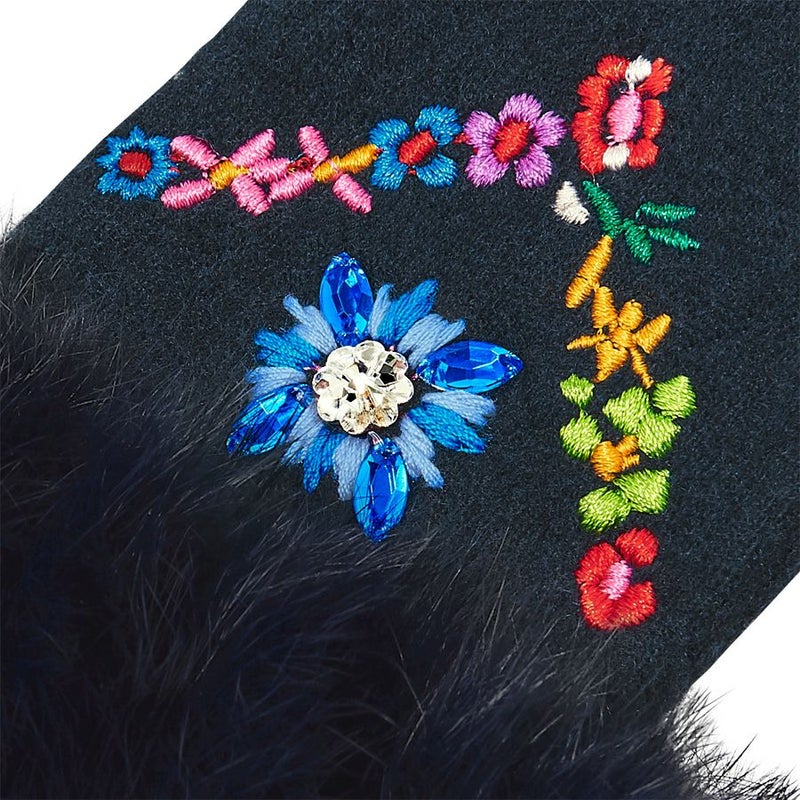 | 素材 | | 表地原産国 | 日本 | | 表地 | ウール72.7%・ナイロン20.7%・カシミヤ6.6% | | 裏地 | - | | 付属 | - | | その他 | ラビットファー・プラスチックパーツ・Swarovski Crystals | | サイズ(約) | | 手囲い | 21~22cm | | 全長 | 23cm | | 最大幅 | 9cm | | 重さ | 25g(片方) | | | 仕様 | | 開口部 | - | | 内側 | - | | 外側 | - | | その他 | 作品により装飾が異なる場合があります 表面片側(手の甲)にプラスチックパーツ装飾 | | 補足情報 | | ※タッチパネル対応(親指・人差し指) ※洗濯及びドライクリーニング、アイロンかけはお避けください | |