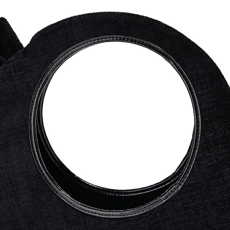 円形のくり抜き型のハンドルは下げても肩に掛けてもスタイリッシュで上品な印象で、エナメル素材のパイピングで光沢をプラスして印象を引き締めました。