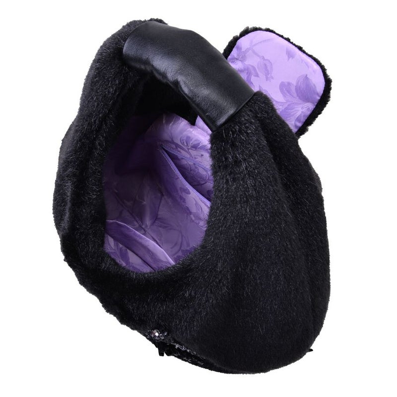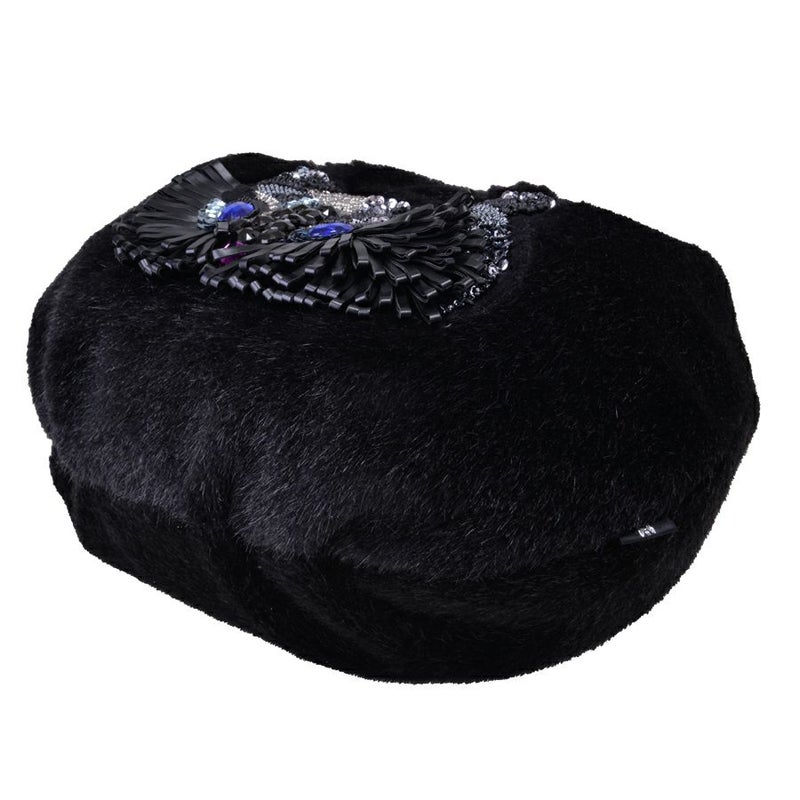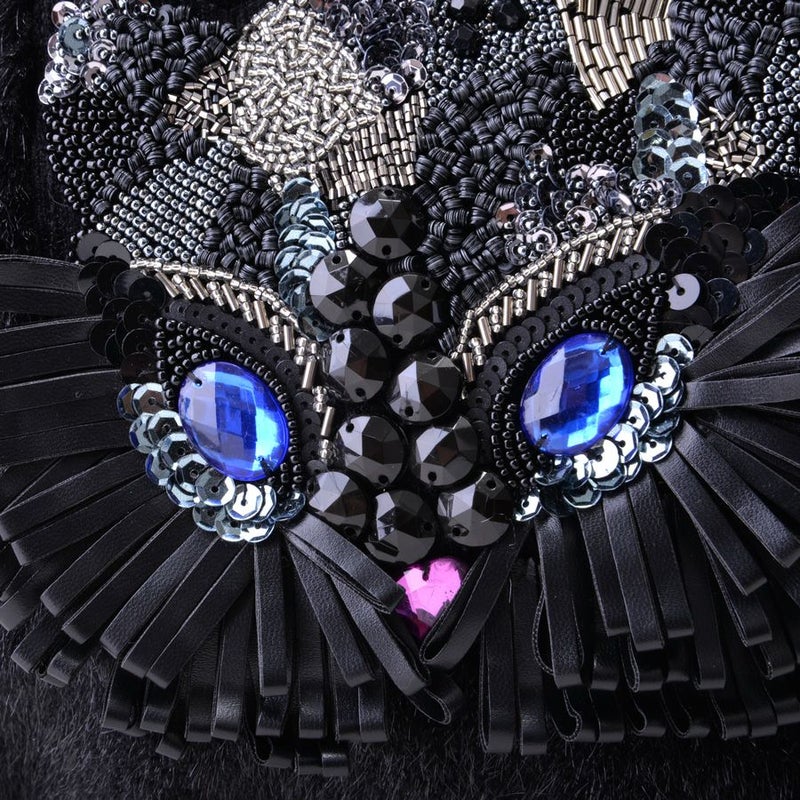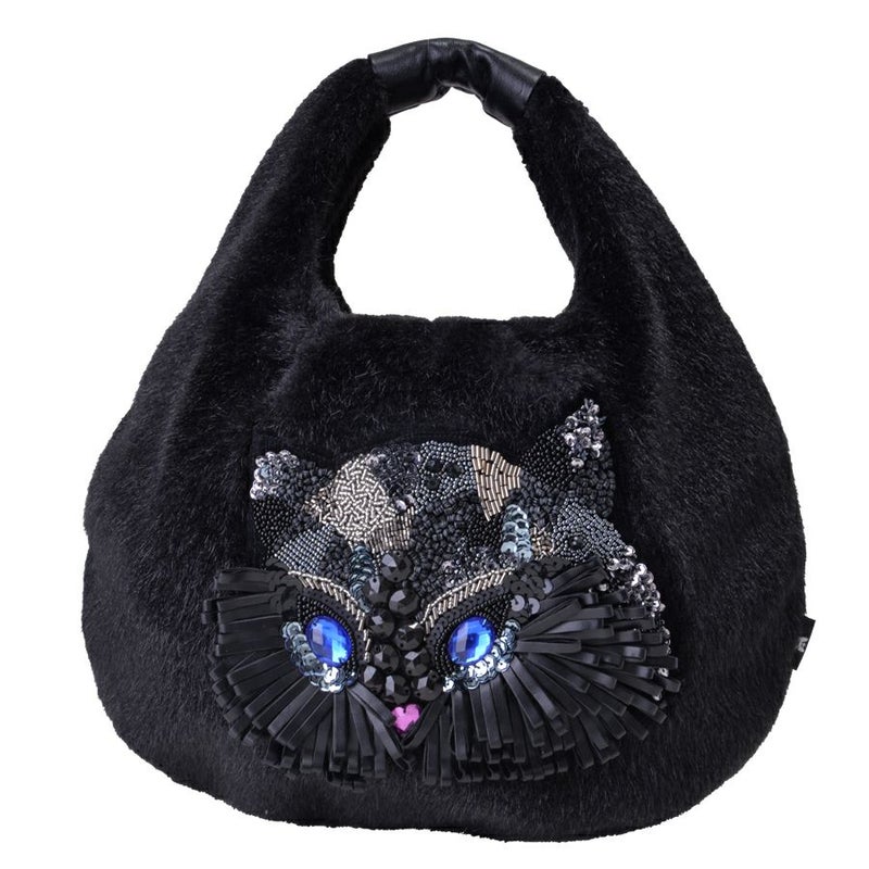 表面はエコレッキスファーを使用し、なめらかな手触りと上品な光沢感が魅力です。フロントには、ビーズやスパンコールを贅沢に敷き詰めて描いたフクロウの顔モチーフ。ブルーに輝く瞳がアクセントになり、シンプルな装いに遊び心をプラスします。 軽量で持ちやすく、肩にも掛けやすい一体型ハンドル仕様。秋冬のコーディネートを華やかに彩る、存在感たっぷりのバッグです。