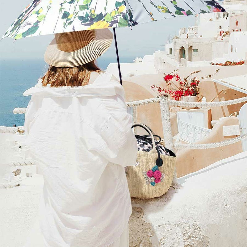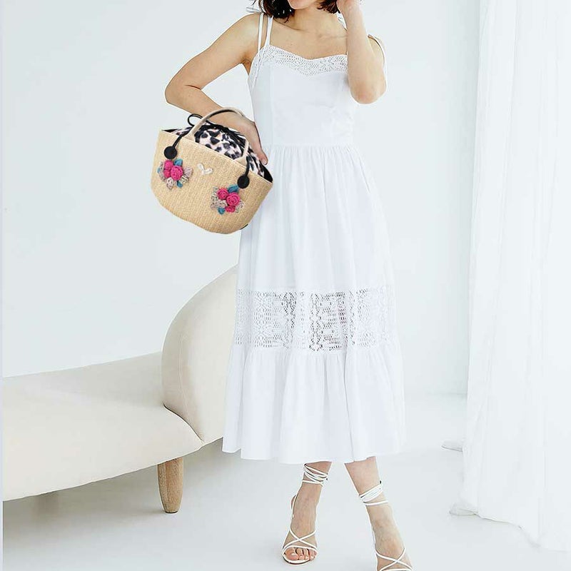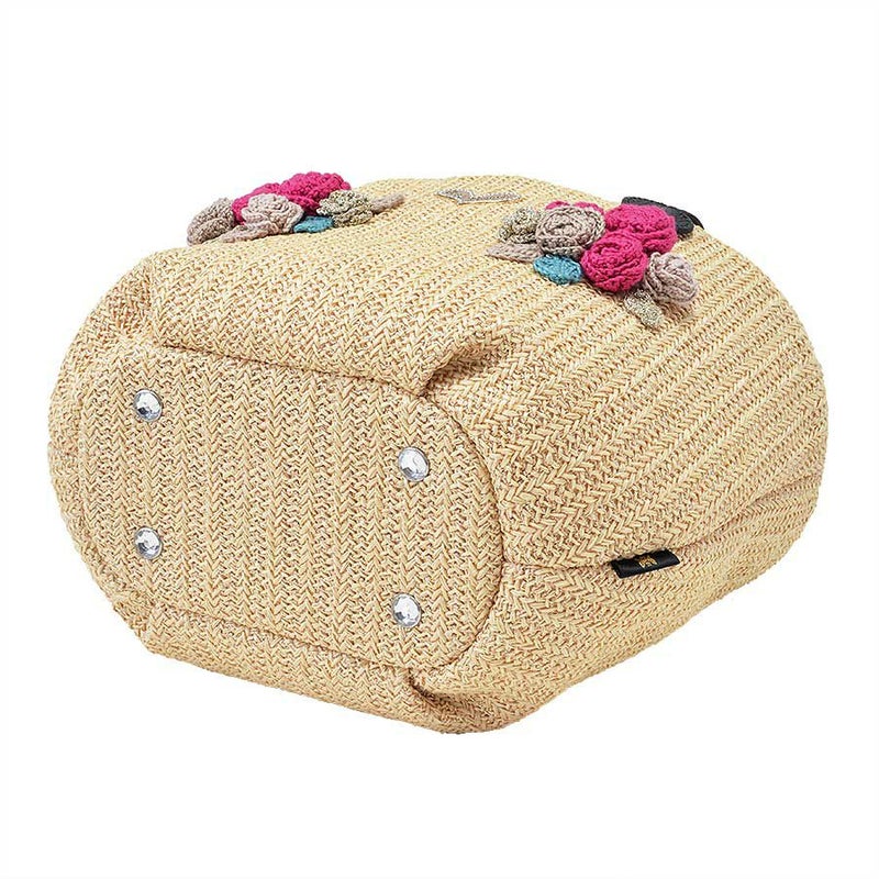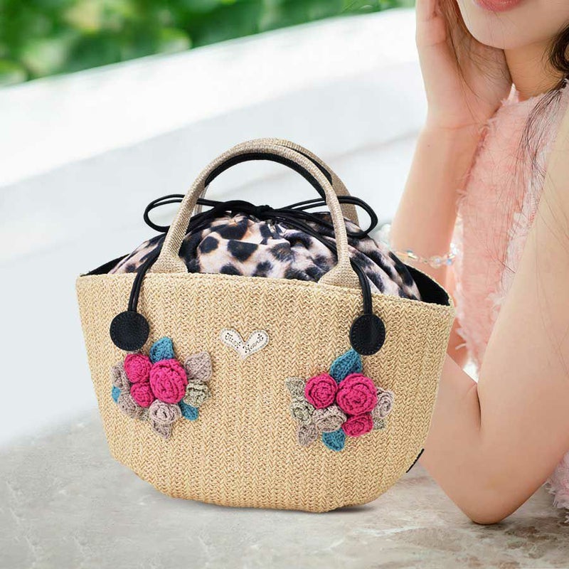 ゴールドのラメ糸を織り込んだ、さらっとした日本製のラフィア風生地に、かぎ針編みの立体フラワーモチーフがキュートに咲いたカゴ風バッグです。