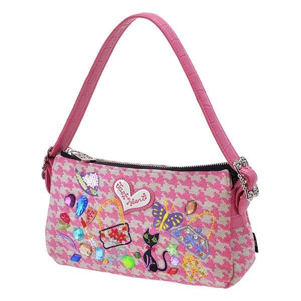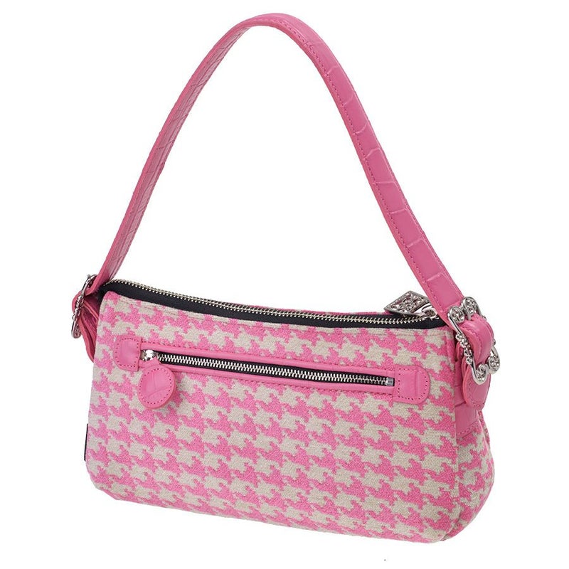 背面にはすぐに取り出したい時に便利なファスナーポケット付き。ファスナー周りのパイピンクにピンクの型押し牛革を使用し、千鳥柄を上品に見せる引き締め効果と高級感のある印象に。