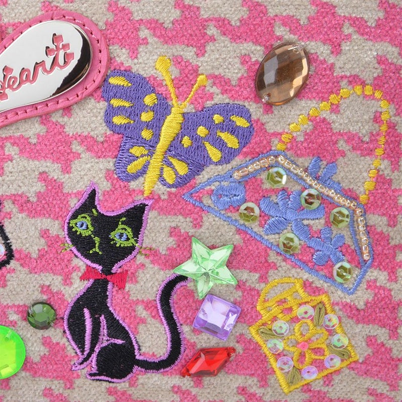 前面には蝶、バッグや香水瓶など女性の大好きなものばかりを集めて刺繍しました。