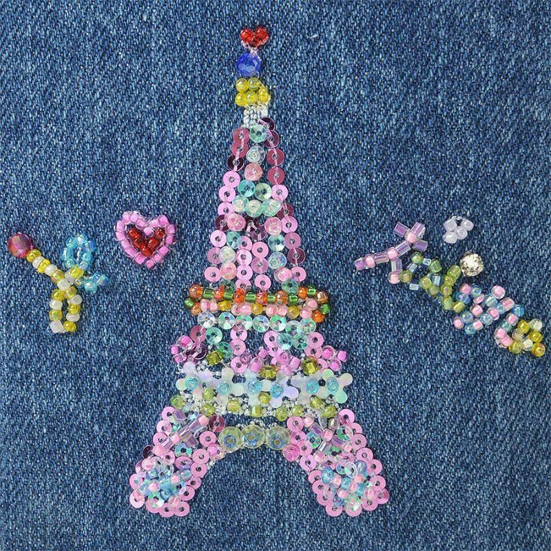 ピンクを中心に、シンクビー!が得意とする様々な色のビーズやスパンコールのデコレーションで、キラキラを纏ったエッフェル塔を描きました。