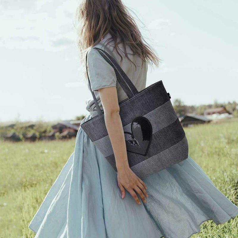 シックなグレー×ブラックの世界に、スパンコールの煌めきが羽音のように響く、大人のための“カッコ可愛い”を詰め込んだバッグです。