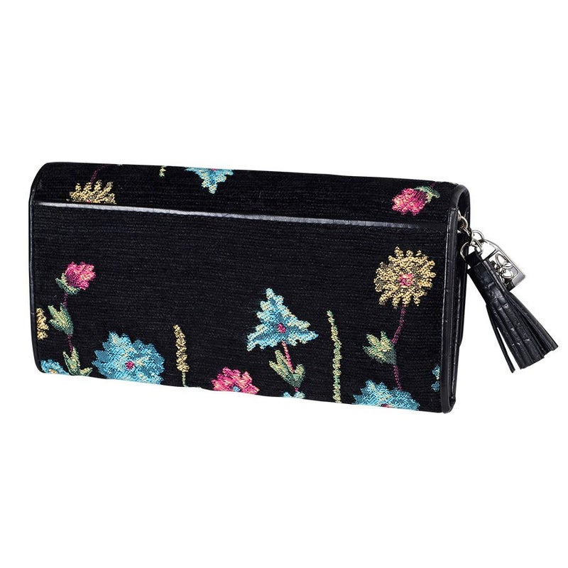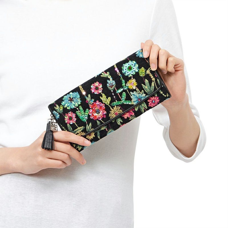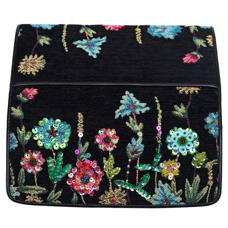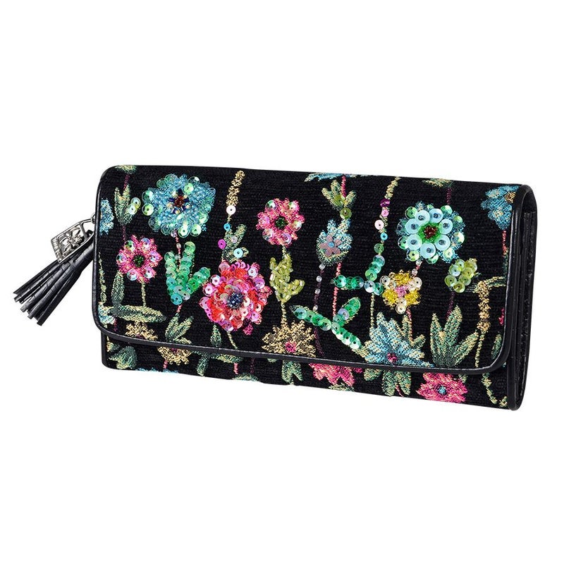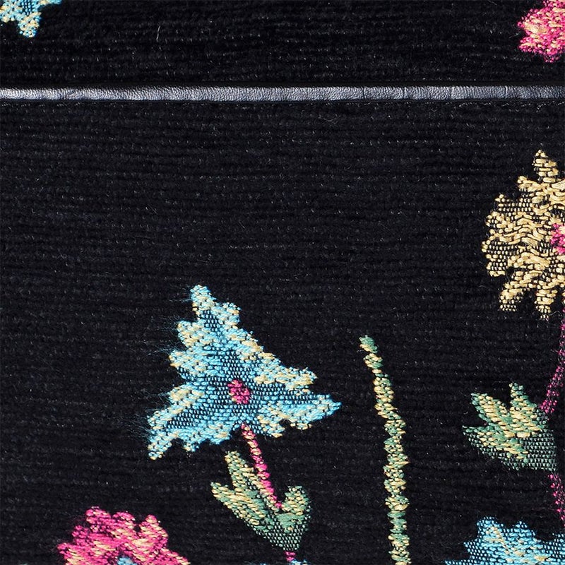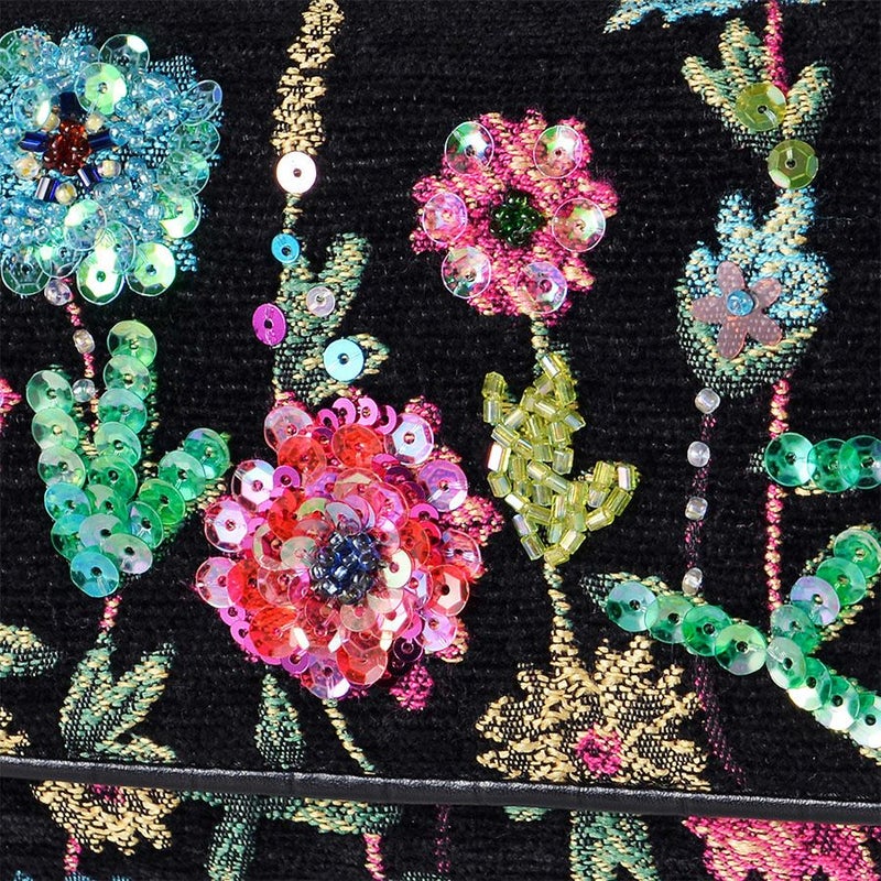 カラフルな花々が咲き並ぶ、イラストタッチのジャカード織生地を使用。その小さな花のひとつひとつに施した刺繍デザインは、パリ在住のシンクビー!デザイナー、博子・クレメールによるもの。ビーズやスパンコールをちりばめて、立体的に愛らしく仕上げました。