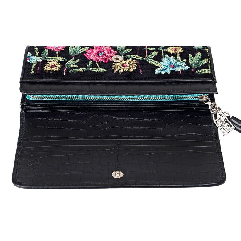 フラップを開けると、ファスナーのライトブルーが鮮やか。内装は高級感のある落ち着いたクロコ型押し牛革。