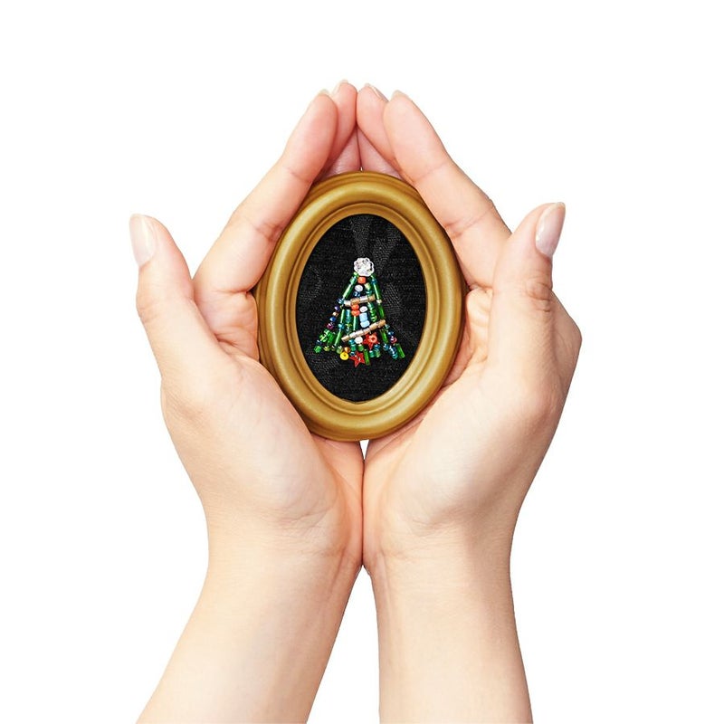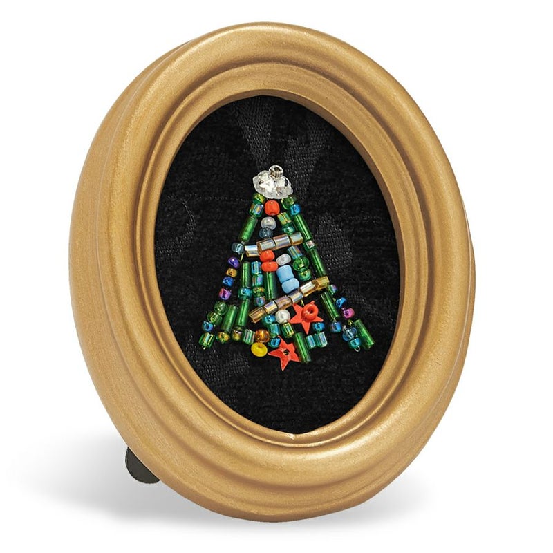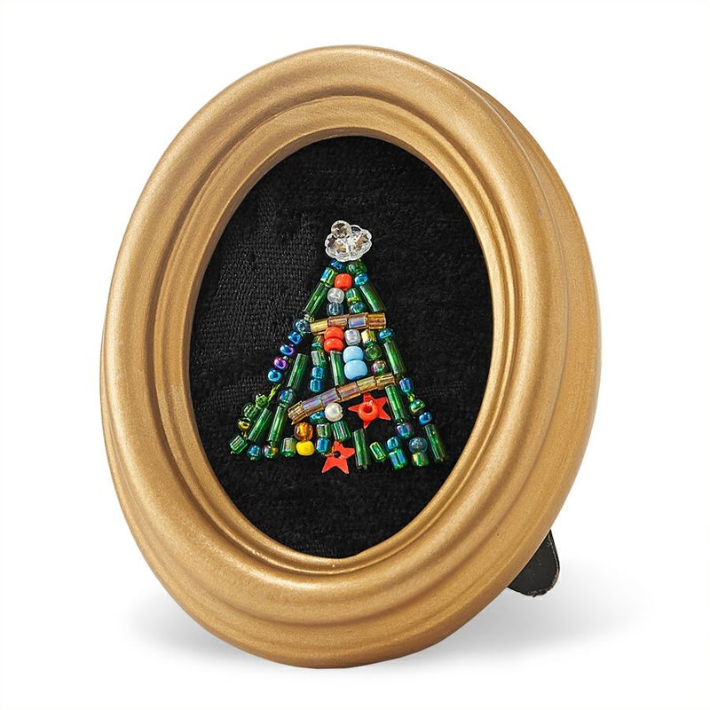 小さいながらも、モミの木の上で輝くトップスターや金色のモール、オーナメントの数々もビーズで表現されています。