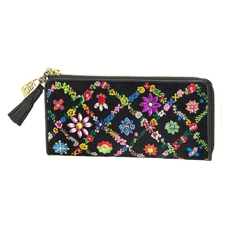 格子状に連なる花々はミシン刺繍。格子の間に咲く花たちは、スワトウ工房の職人が丁寧に手刺繍で仕上げました。爪付きのスワロフスキー・クリスタルをはじめビーズやスパンコール、ラインストーンがちりばめられ、キラキラと煌きを放ちます。