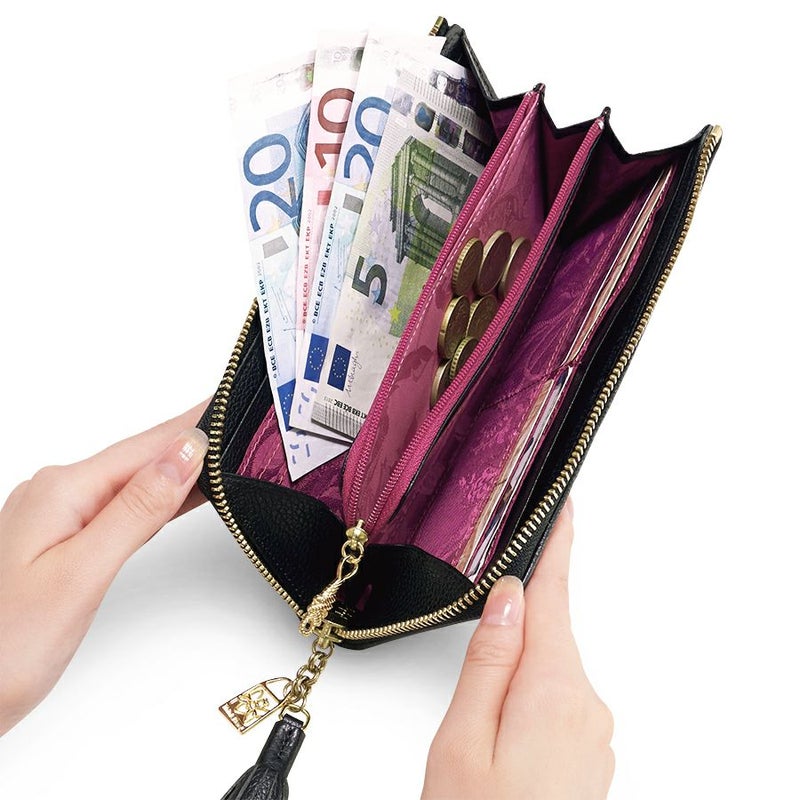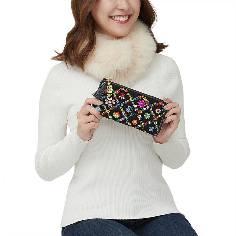 小銭入れのファスナーがカーブを描きながら下へ開くので、中身が見やすく出し入れ簡単。