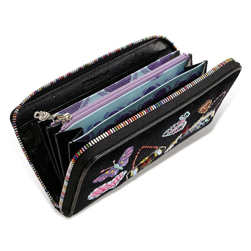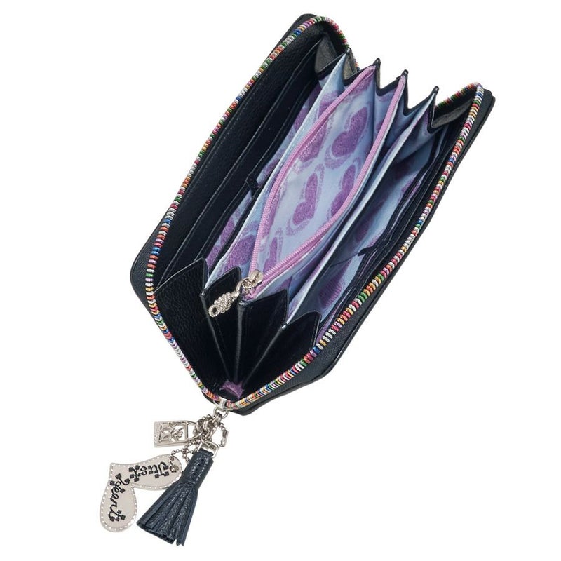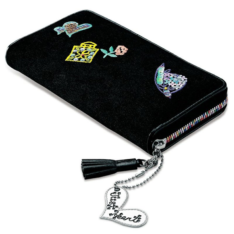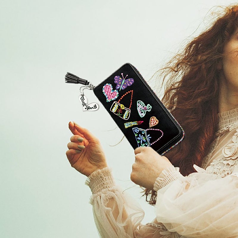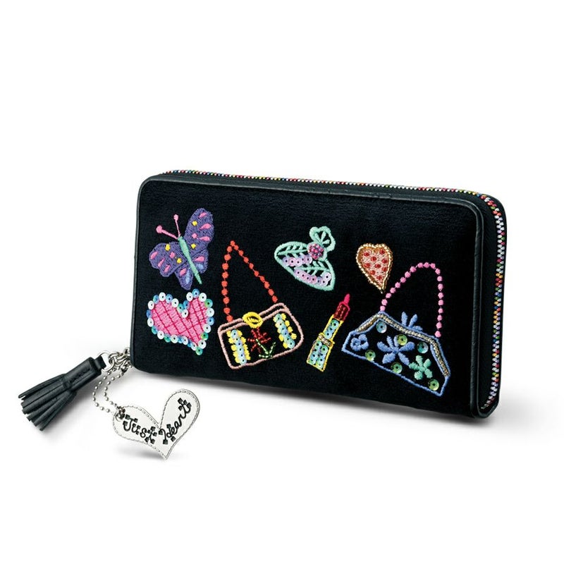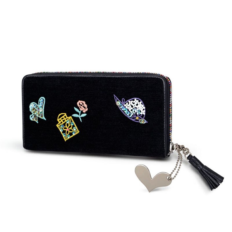 黒地にバッグや香水の可愛い💕刺繍やカラフルなレインボーファスナーが素敵✨✨ 引き手にレザーのタッセルとjust Heartのプレートのチャームが付いていて可愛い〜💕 可愛い〜がいっぱいのお財布です🎶