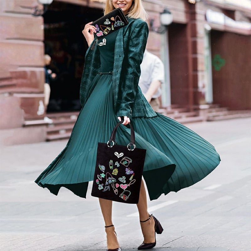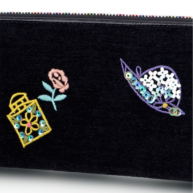 なめらかで深みのあるブラック生地に、バッグや香水瓶など女性が大好きなものを集めてカラフルにミシン刺繍で表現。さらにその上からビーズ、スパンコールをあしらって華やかさをアップしました。