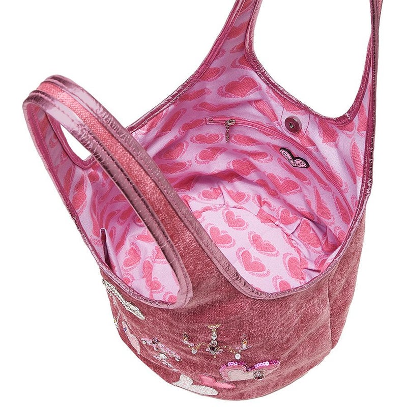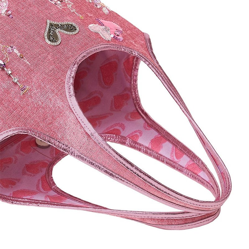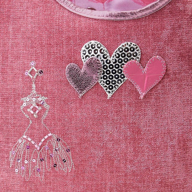 手触りの良い光沢のあるピンクのイタリア製生地に、プリンセスの弾む心の内をそのまま刺繍で表現したようなモチーフと、レザーハートをビーズやスパンコール、クリスタルガラスなどバランスよく散りばめて輝きを添え、装飾やマグネットなどのパーツには、ピンクのベースに合うシルバーを効かせました。動きにあわせて反射する光の輝きが、上品なアクセントになっています。