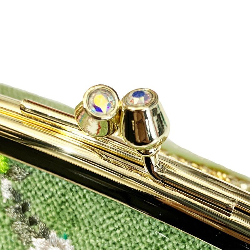 グリーンのイタリア製生地に、格子状に連なる花々はミシン刺繍。格子の間に咲く花たちは、スワトウ工房の職人が丁寧に手刺繍で仕上げました。爪付きのスワロフスキー・クリスタルやビーズがちりばめられ、キラキラと煌きを放ちます。