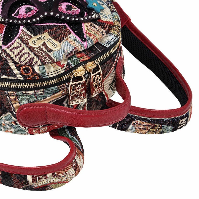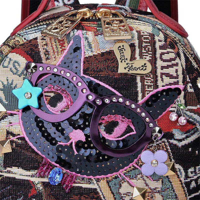 やんちゃな面差しの黒ネコは、とんがった耳や、きりっと結んだ口元などを、ビビッドピンクのミシン刺繍でかたどり、毛並みをスパンコール刺繍で表現しました。