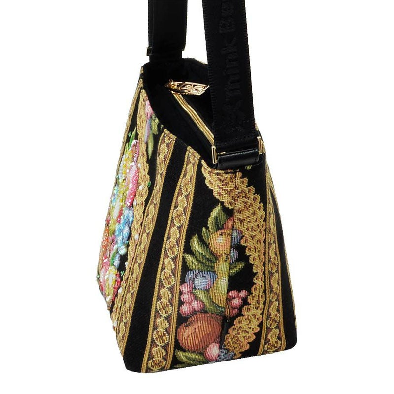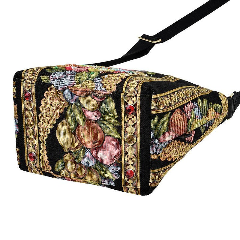 まるで絵画のように描き出された、たわわに実った杏やブルーベリー、洋梨などのフルーツと、優雅に舞うリボンが交差しあうデザインが印象的。