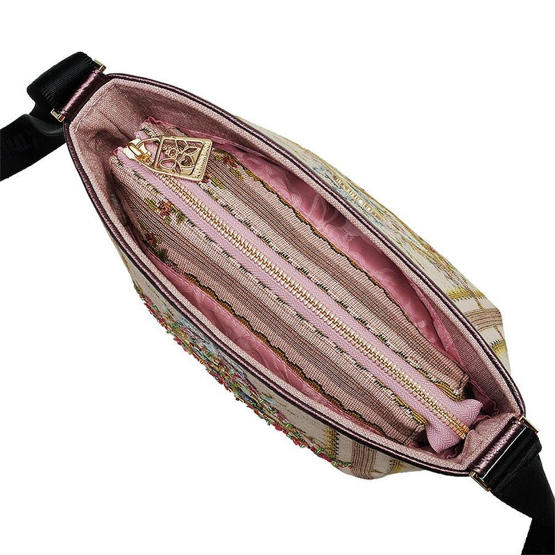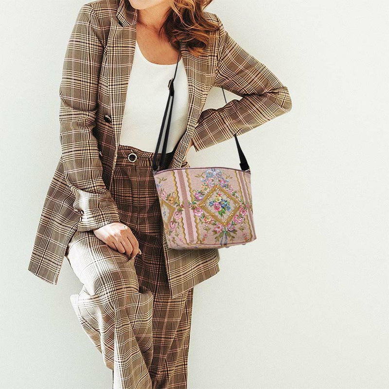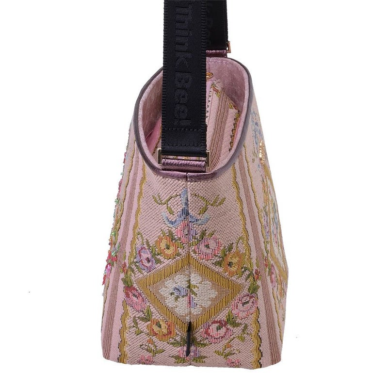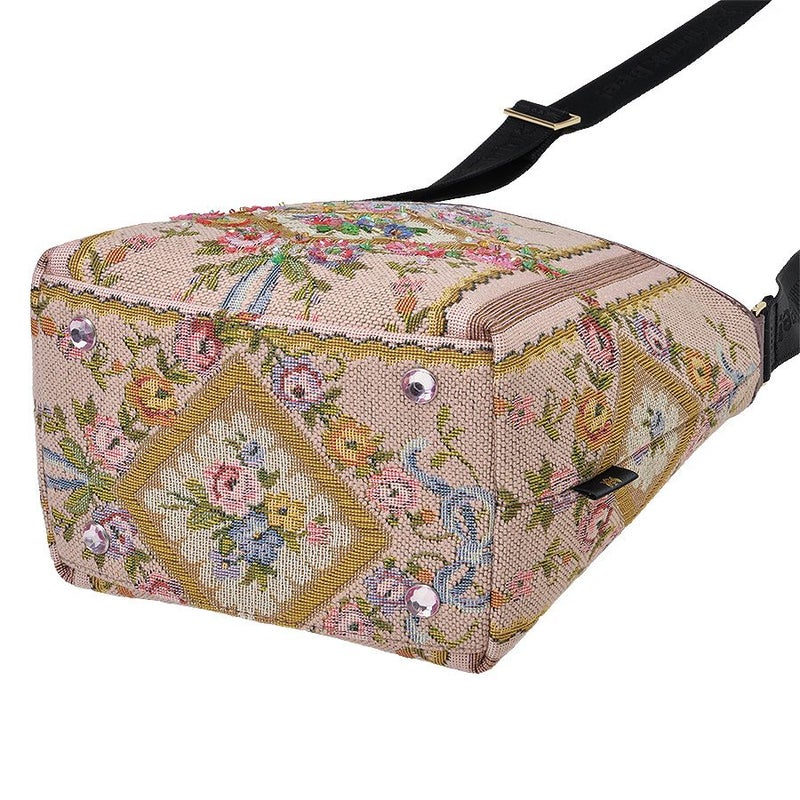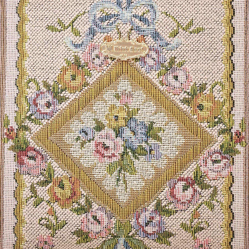 表地のイタリア製ゴブラン織生地は、ブーケやたくさんのミニバラが織り込まれた甘く優美な柄で、フランス王妃マリー・アントワネットの生きたロココ調の宮殿装飾のイメージ。