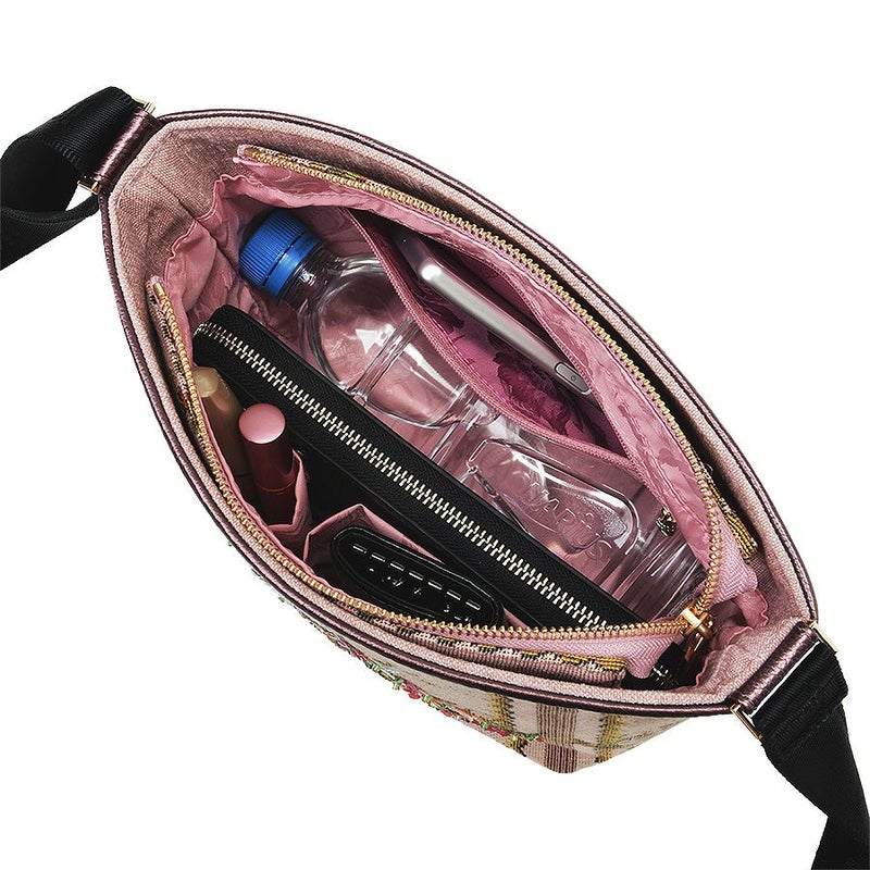 | | ストラップ | ナイロン | | その他 | 牛革 | | サイズ(約) | | 本体(突起部を除く最大) | H 19 × W 27 × D 13 cm | | ハンドル立ち上がり | -/- | | ショルダーストラップ長さ | 70~131 cm/無段階調節 | | 重さ | 370g | | | 仕様 | | 開口部 | ファスナー式 | | メイン室 | 1 /- | | 内側 | ファスナー付ポケット×1・オープンポケット×2・前後オープンポケット×2 | | 外側 | - | | ハンドル | - /ショルダーストラップ | | 底鋲 | 4 | | その他 | 作品により柄の出方や装飾が異なる場合があります | | 補足情報 | | - | |