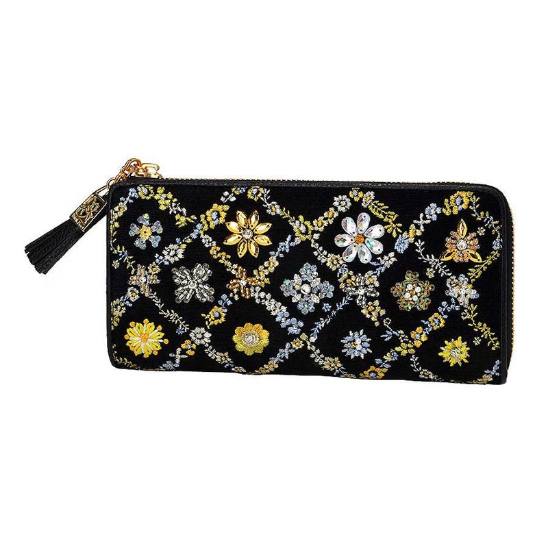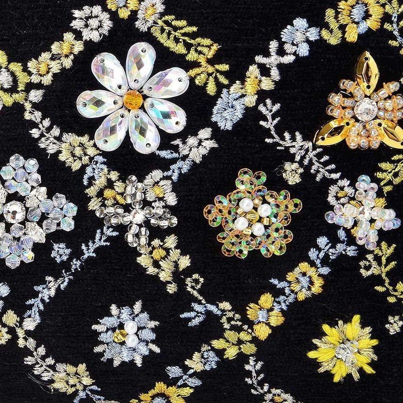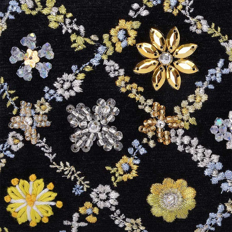 格子の間に咲く花たちは一つひとつが異なるデザイン。 格子状に連なる花々はミシン刺繍。 格子の間に咲く花たちは、スワトウ工房の職人が丁寧に手刺繍で仕上げました。 爪付きのクリスタルガラスをはじめビーズやスパンコール、ラインストーンがちりばめられ、キラキラと煌きを放ちます。