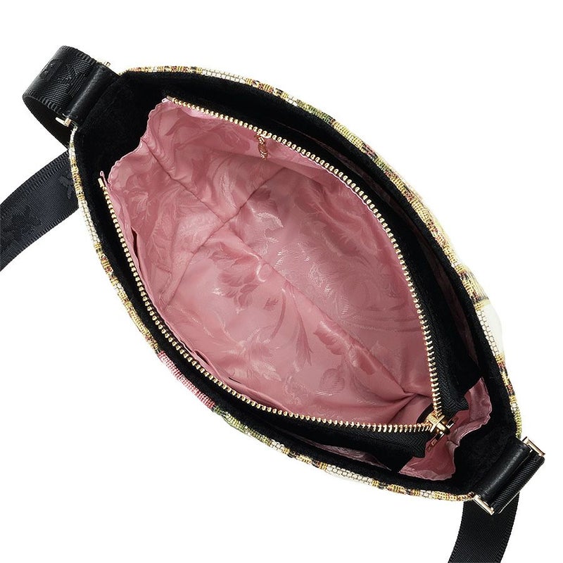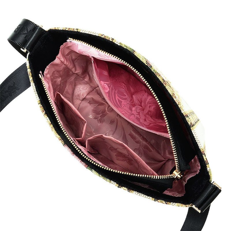 コットン10% | | ストラップ | ナイロン・牛革 | | その他 | - | | サイズ(約) | | 本体(突起部を除く最大) | H 19 × W 26.5 × D 13 cm | | ハンドル立ち上がり | -/- | | ショルダーストラップ長さ | 71~133 cm/無段階調節 | | 重さ | 380g | | | 仕様 | | 開口部 | ファスナー式 | | メイン室 | 1 /- | | 内側 | ファスナー付ポケット×1・オープンポケット×2・前後オープンポケット×2 | | 外側 | - | | ハンドル | - /ショルダーストラップ | | 底鋲 | 4 | | その他 | 作品により柄の出方や装飾が異なる場合があります | | 補足情報 | | - | |