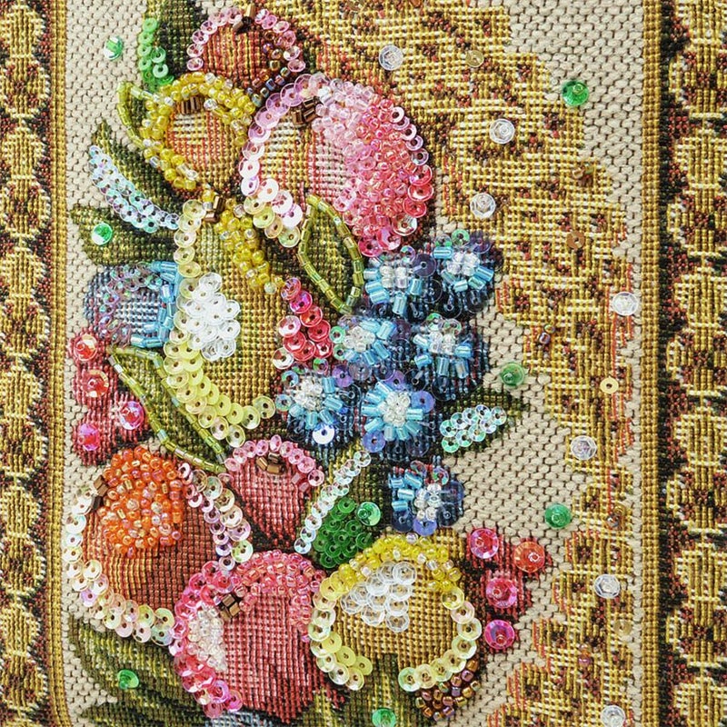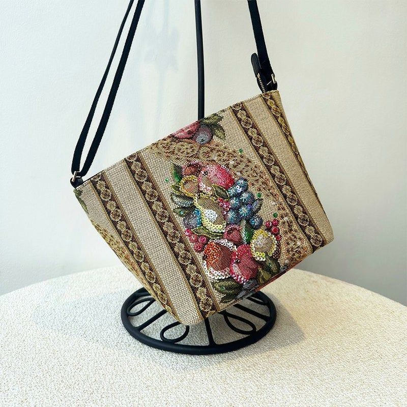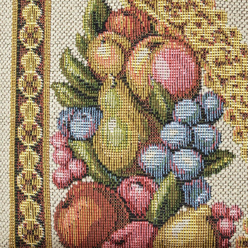 まるで絵画のように描き出された、たわわに実った杏やブルーベリー、洋梨などのフルーツと、優雅に舞うリボンが交差しあうデザインが印象的。
