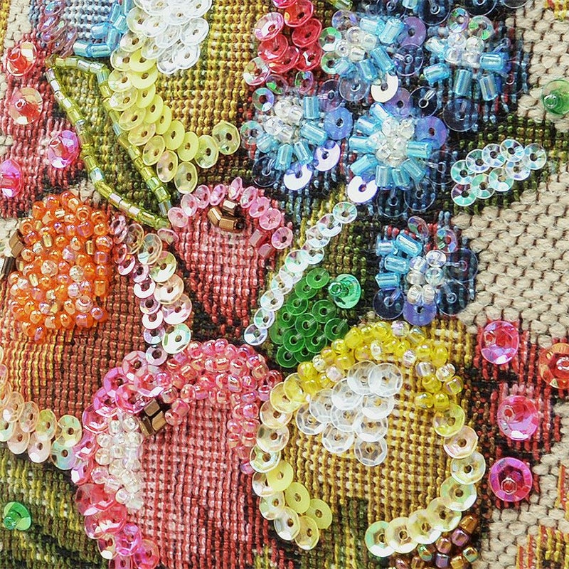 このイタリア製ゴブラン織生地に、シンクビー! が得意とするビーズ&スパンコールで煌めき装飾を丁寧に施しました。