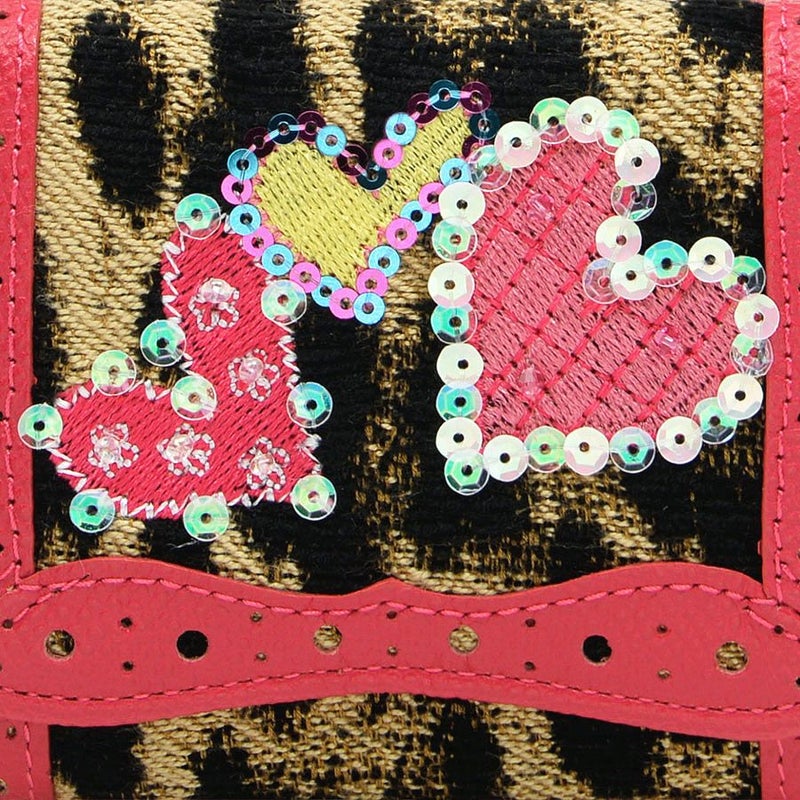 イタリア製レオパード柄のジャカード織生地をベースに、装飾はカラフルでポップなハートをミシン刺繍であしらい、その上にスパンコールやスワロフスキー・クリスタルで多彩な煌めきを散りばめて、華やぎと可愛さUP。