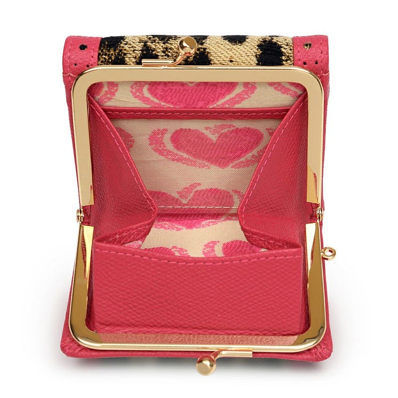 開けると牛革に色味を合わせたベージュ×ピンクハートプリント生地で統一感を出しました。内側は透明ポケット付き。