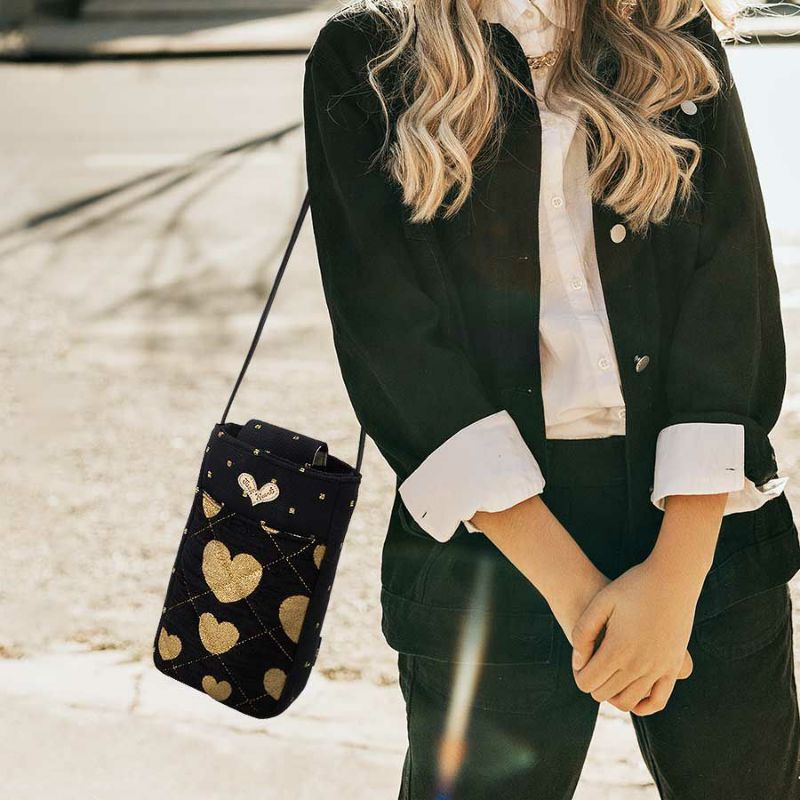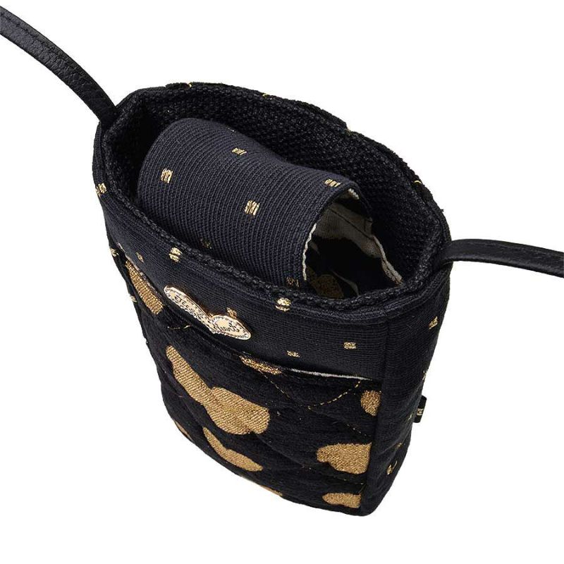 ブラックとゴールドのコントラストを効かせた、ゴールドのハートにステッチが効いた生地とドット柄のコンビネーション。
