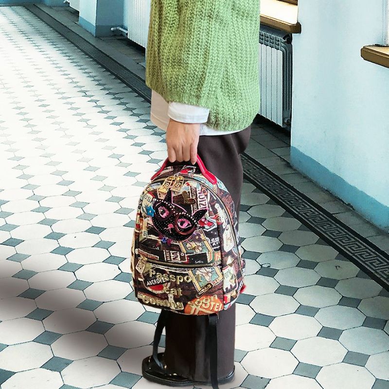 やんちゃな面差しの黒ネコは、とんがった耳や、きりっと結んだ口元などを、ビビッドピンクのミシン刺繍でかたどり、毛並みをスパンコール刺繍で表現しました。