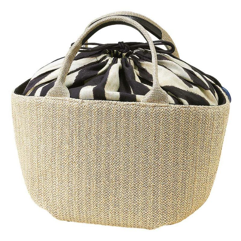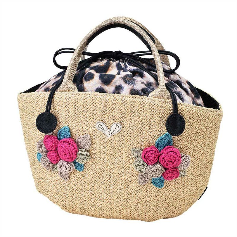 ゴールドのラメ糸を織り込んだ、さらっとした日本製のラフィア風生地に、かぎ針編みの立体フラワーモチーフがキュートに咲いたカゴ風バッグです。
