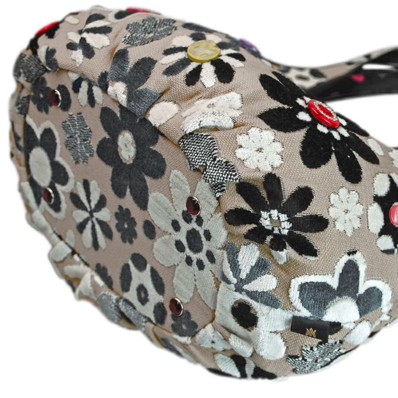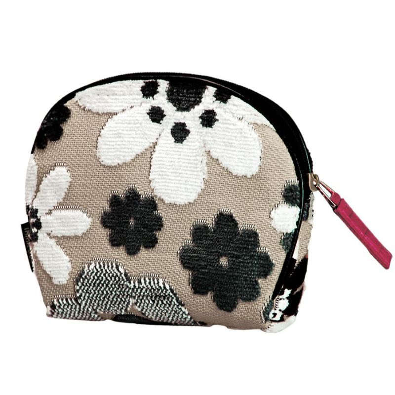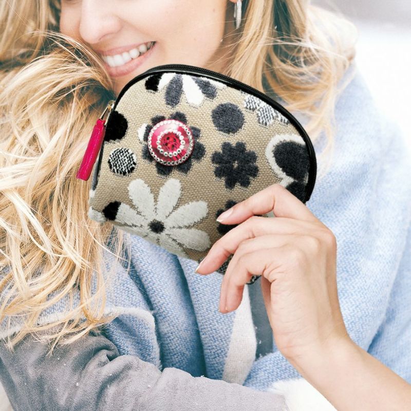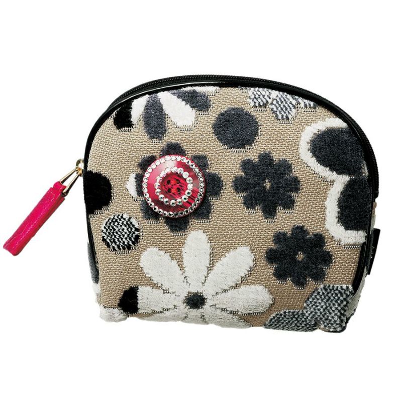 表地はパイルを凹凸に織り込んで柄を表現しているベルギー製の織物で、ふわふわとした手触りが特長。ベージュ地にモノトーンでシックに表現されたマーガレットの中心に配したのは、オリジナルで染め上げた11色のキュートなボタン。