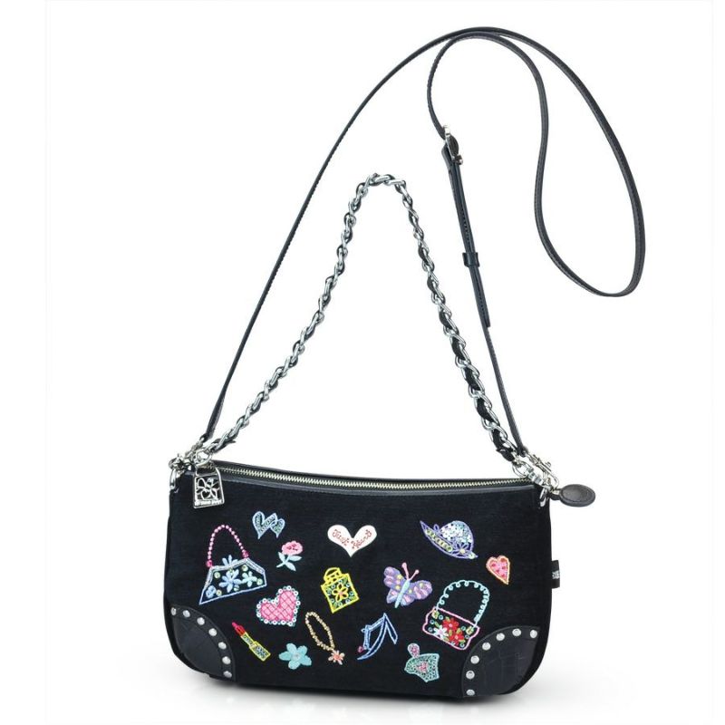 アクセサリーやバッグ、靴、帽子、コスメ、フレグランスなど、女の子が大好きなアイテムをカラフルな糸で刺繍し、ビーズやスパンコールで華やかに仕上げました。