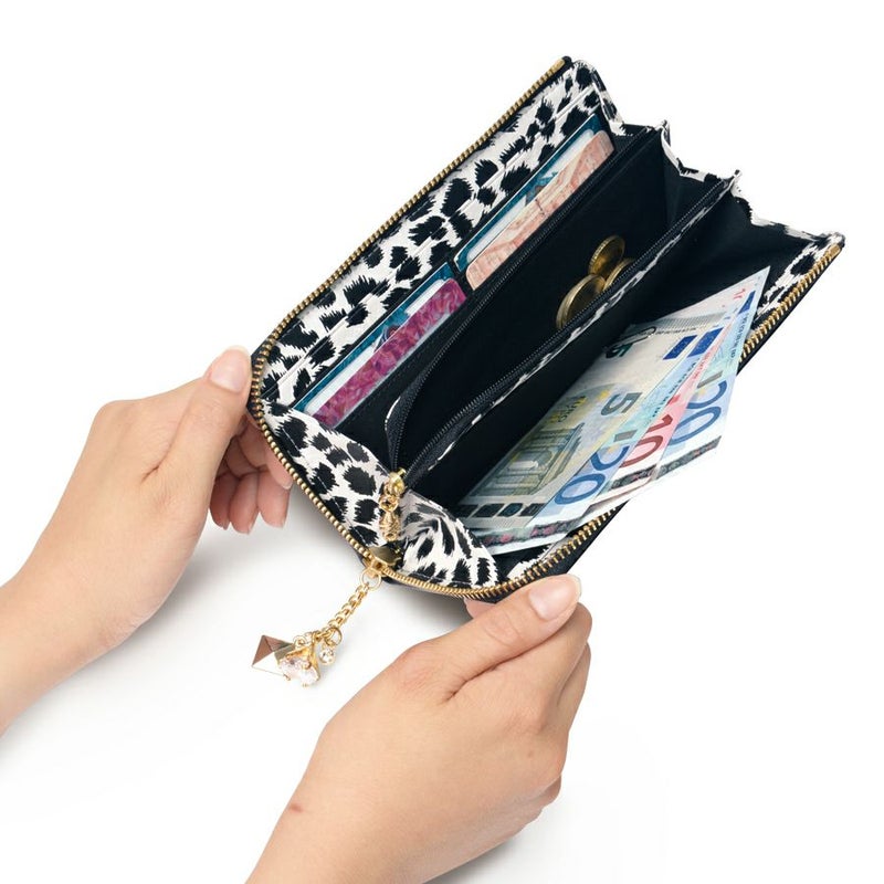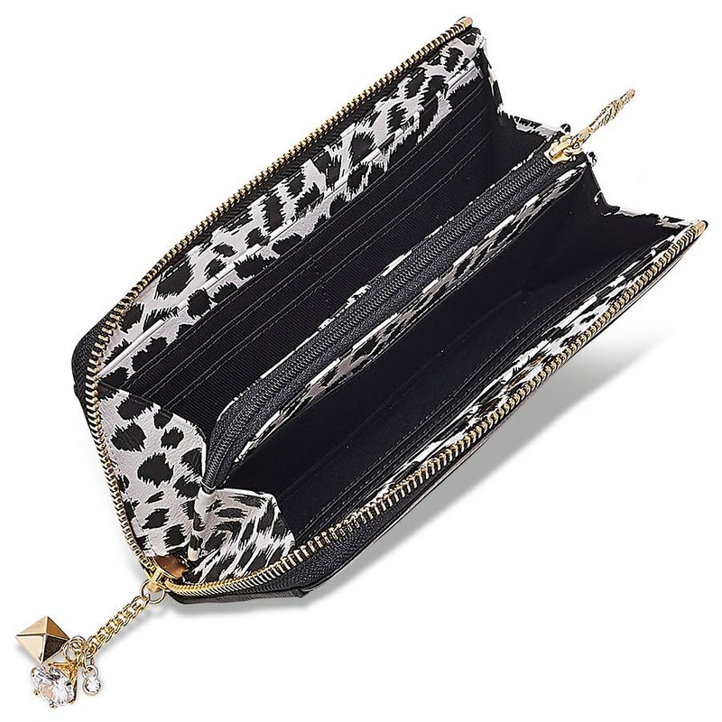 L型のファスナーを開けると、中は驚きのレオパード。ボディのレオパードとは異なり、牛革にホワイト×ブラックのモノトーンでプリントしたインパクト素材を使ってサプライズを演出しました。